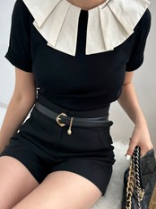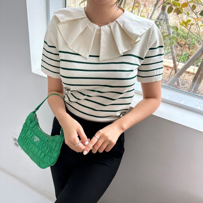 [EWQ] ピーターパン襟プリーツコントラスト Tシャツストライプ弾性半袖ニット Tシャツトップ夏潮 Tシャツ ショート ハーフスリーブ エラスティック 伸縮 サマー 夏物