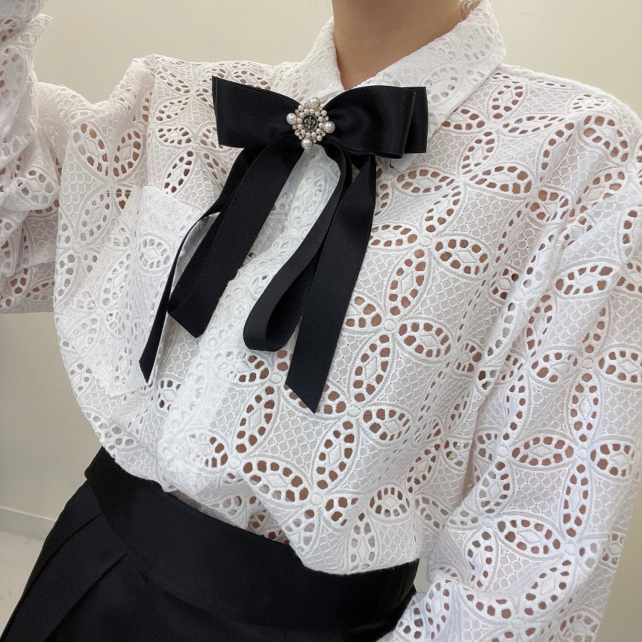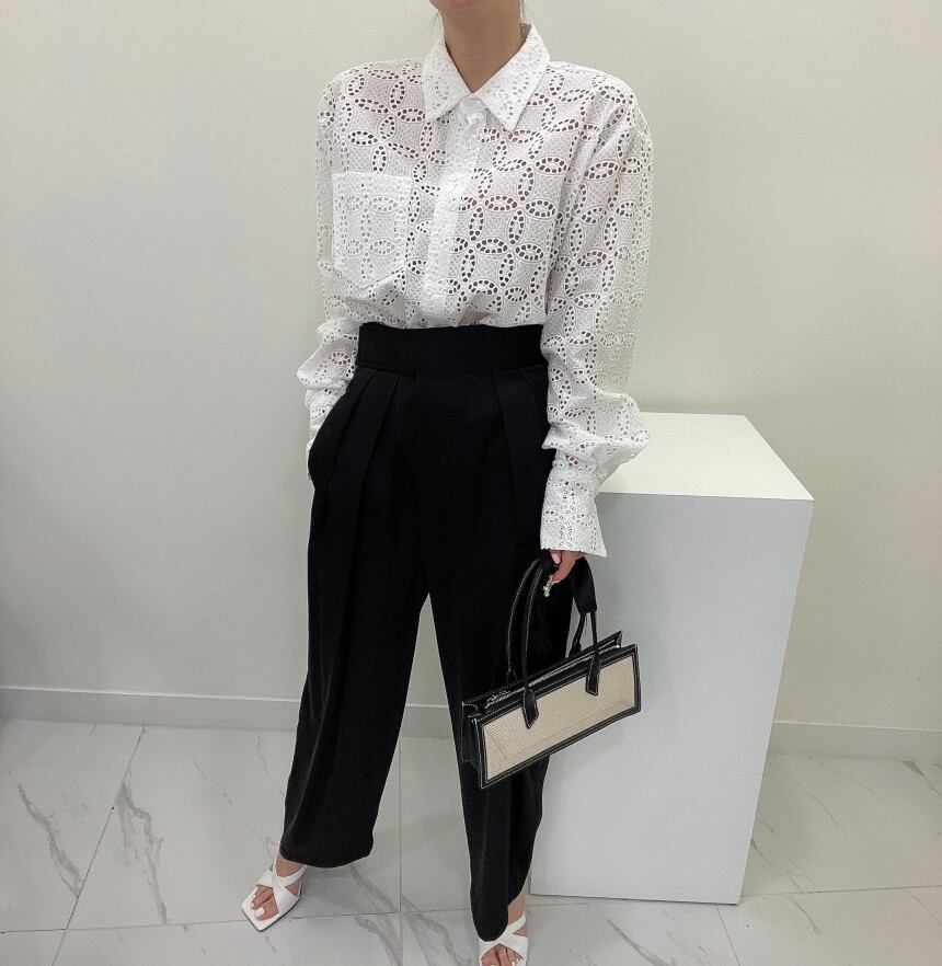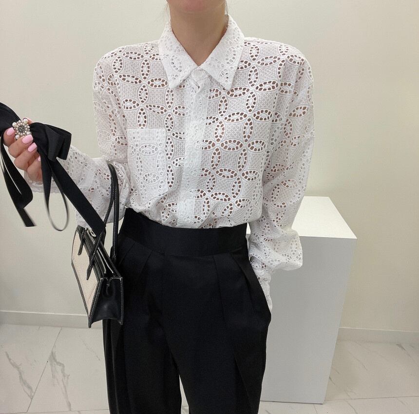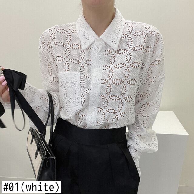 [EWQ] レディース フック フラワー 中空アウト シャツ シングルブレスト 無地 ゆったり 長袖 ブラウス 春潮 トップス ロング スプリング 春物 ソリッドカラー フラワーデザイン
