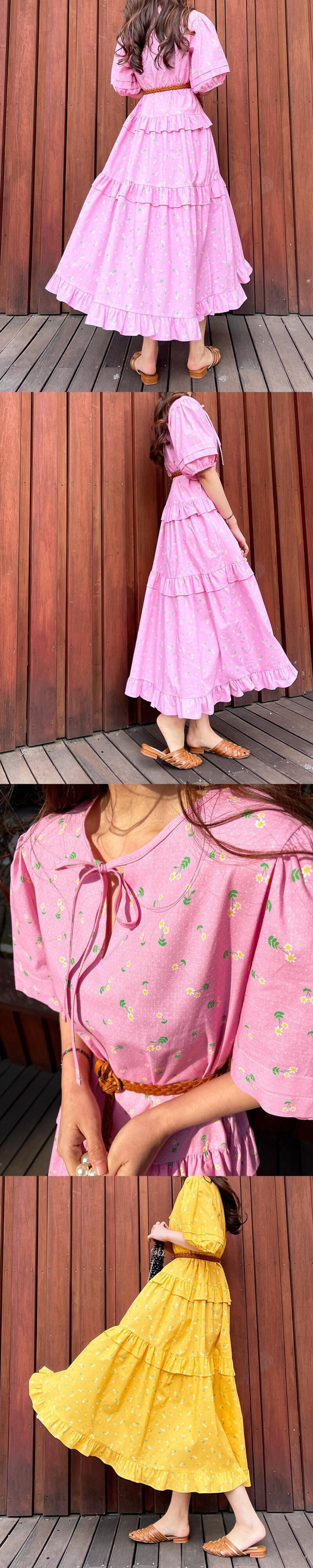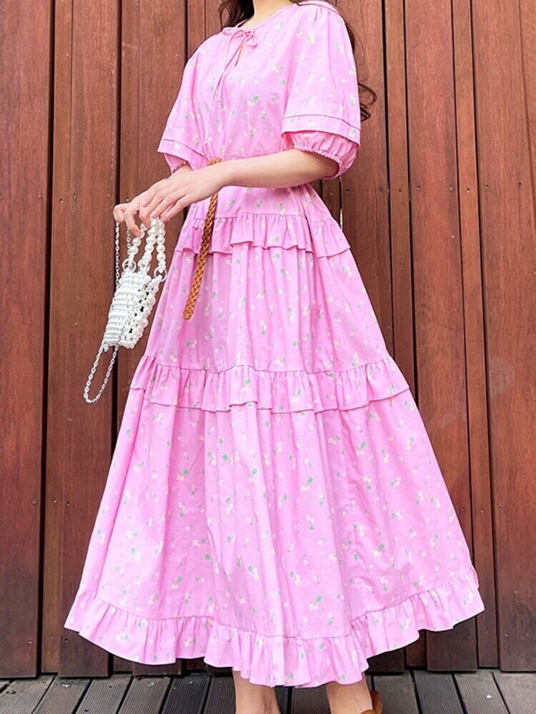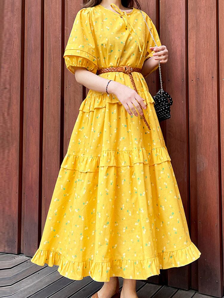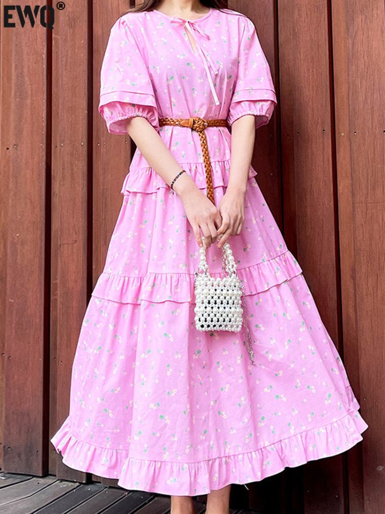 [EWQ] フリル スプライス プリント ドレス コントラスト半袖レースアップ ドレス夏潮 Vestido ショート ハーフスリーブ サマー 夏物