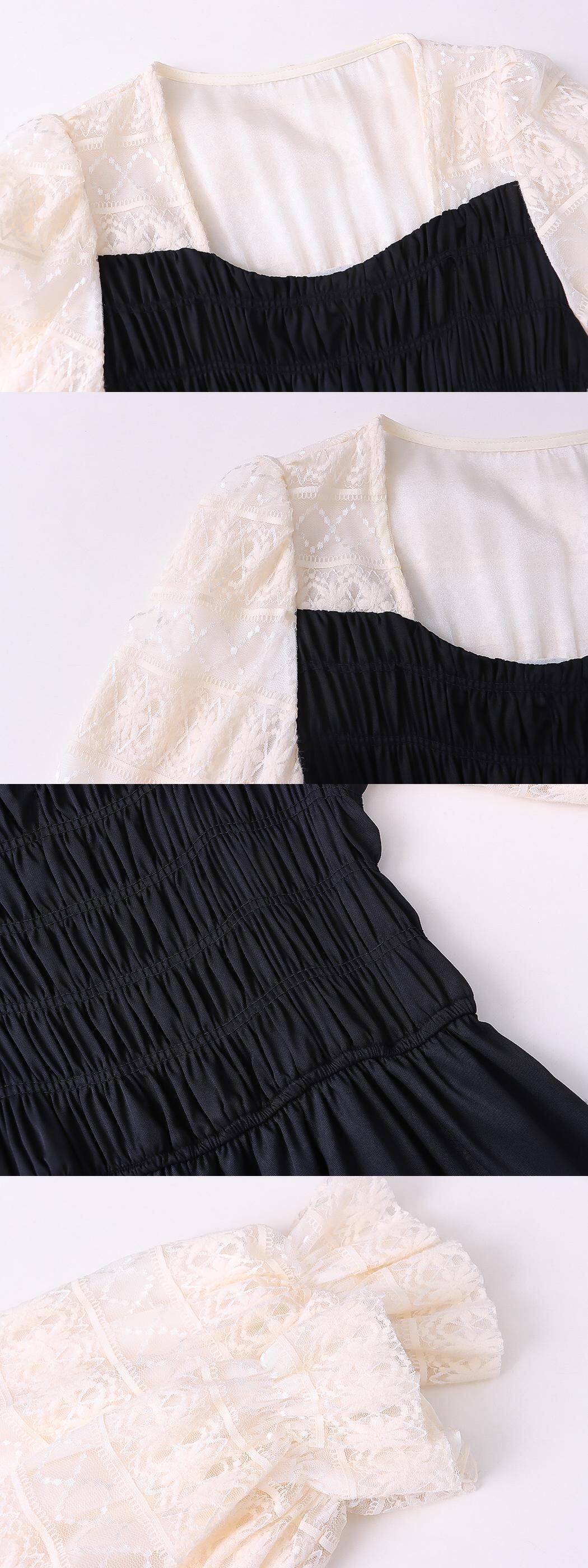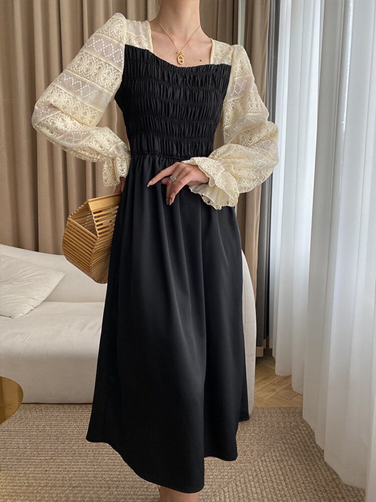 [EWQ] スクエア ネック コントラスト ドレス長袖レース パッチワーク ドレス春潮 Vestidos ロング スプリング 春物 スクウェア
