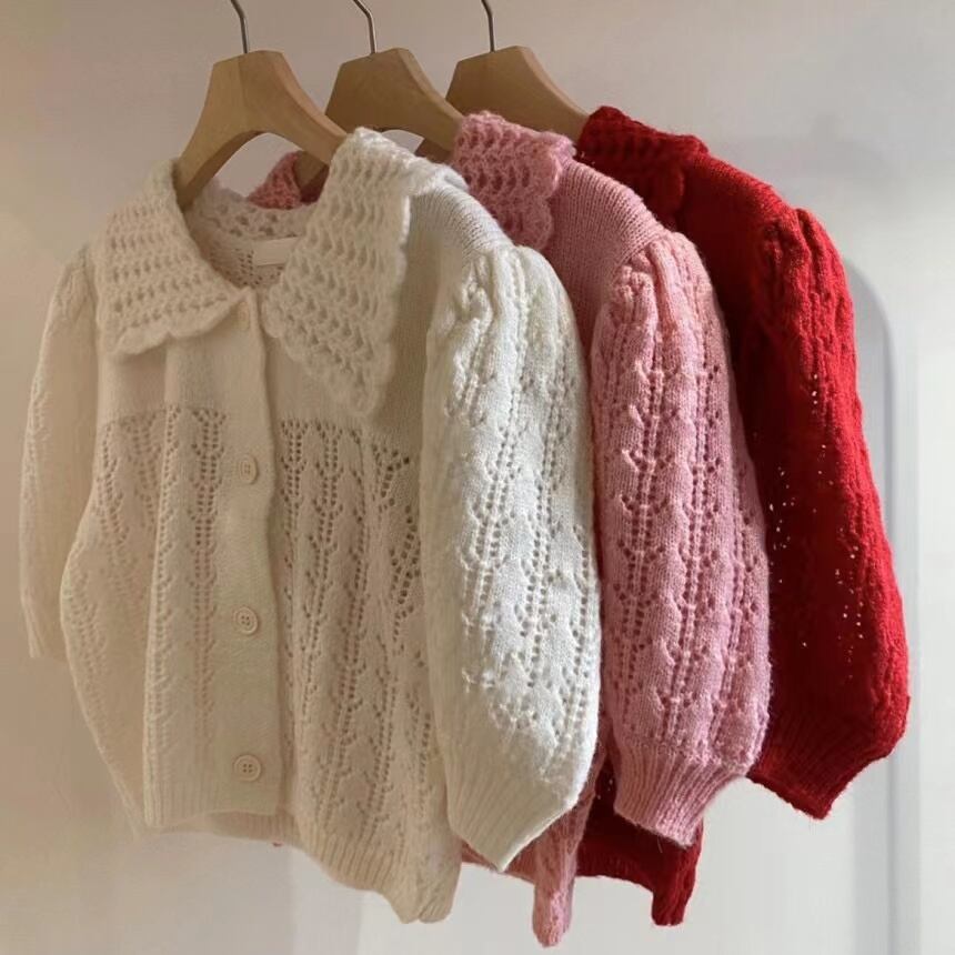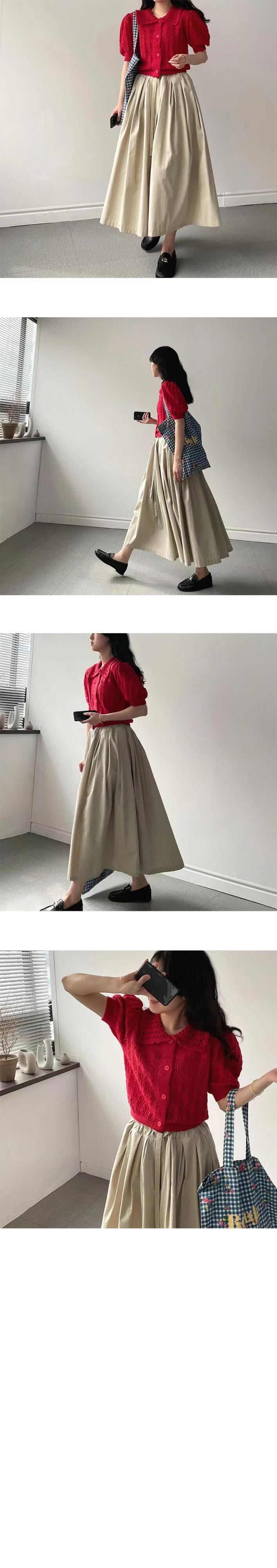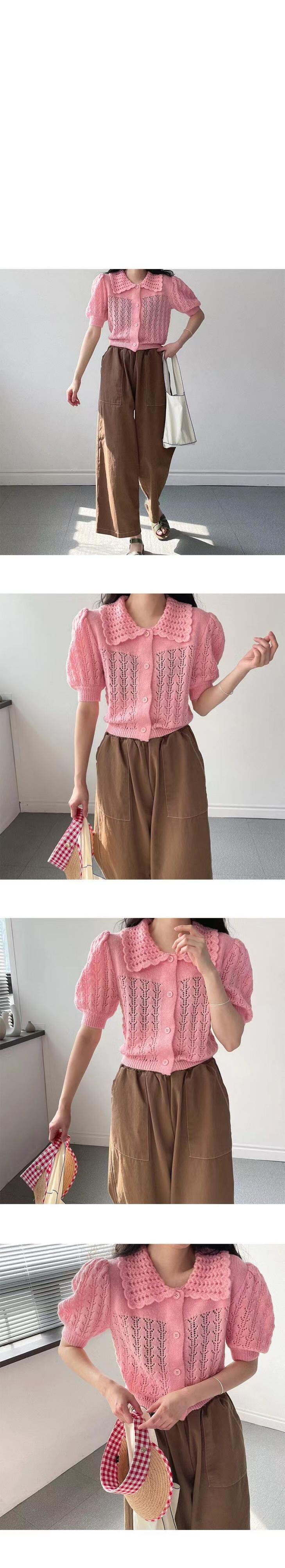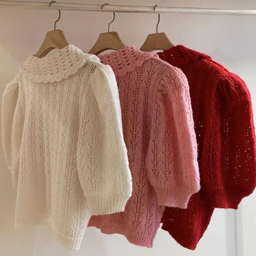 [EWQ] 甘いカットアウトジャカードシャツパフスリーブ因果シングルブレストニットブラウストップ夏潮トップス 6Y8425 大人ガーリー スウィート キュート カジュアル サマー 夏物