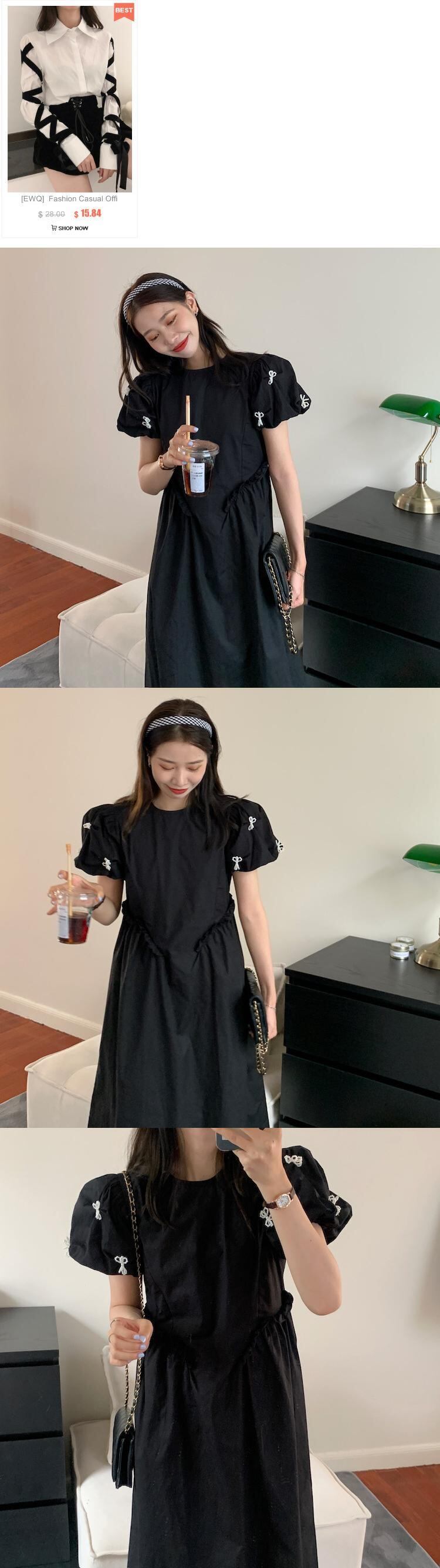 [EWQ] シックボウドレス夏ギャザーウエストパフスリーブドレスロングローブ レッド リボン サマー 夏物
