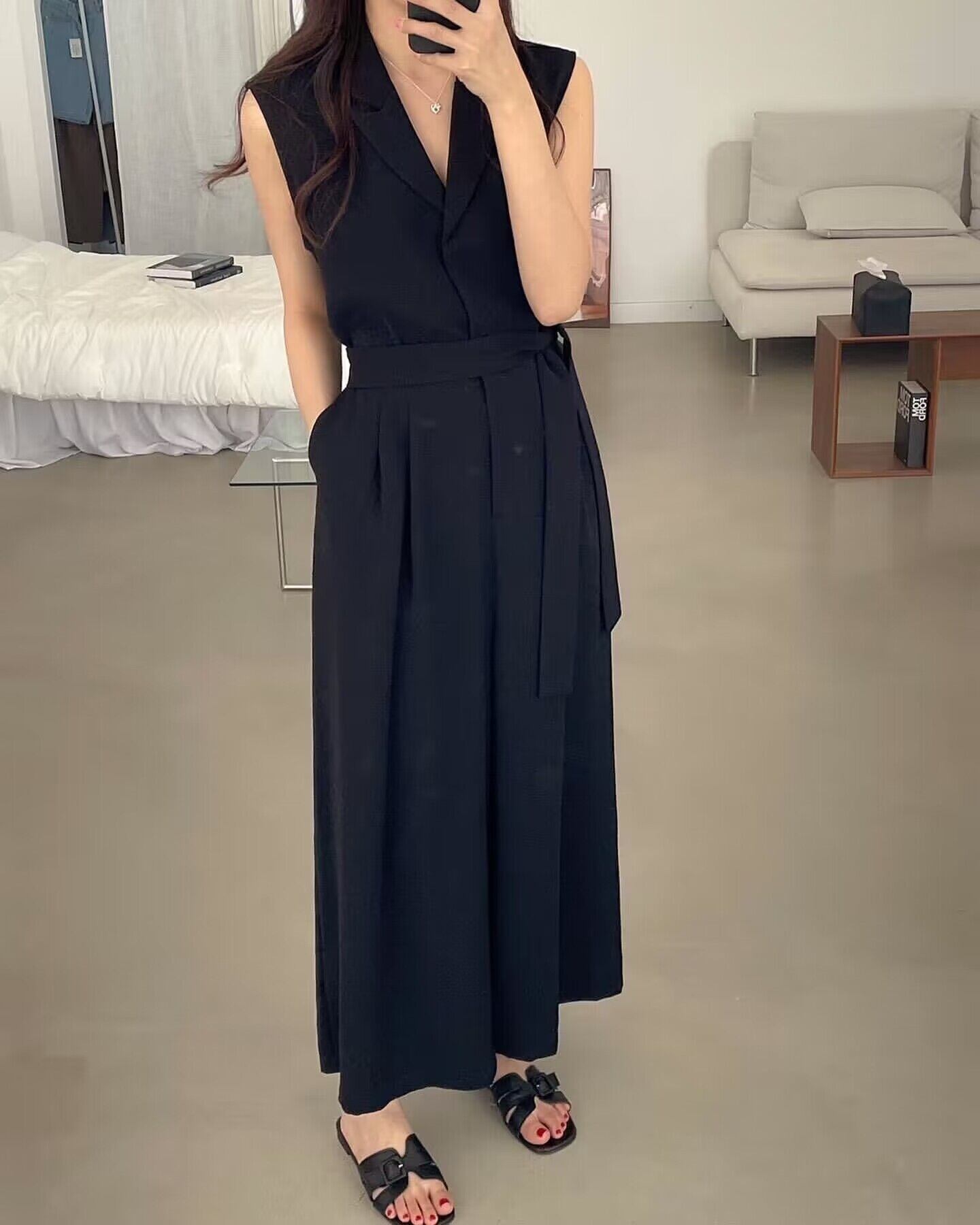[EWQ] ノッチレースアップジャンプスーツスリムフィット無地ノースリーブワイドレッグジャンプスーツ夏潮オールマッチ服 サマー 夏物 ワイドパンツ ソリッドカラー