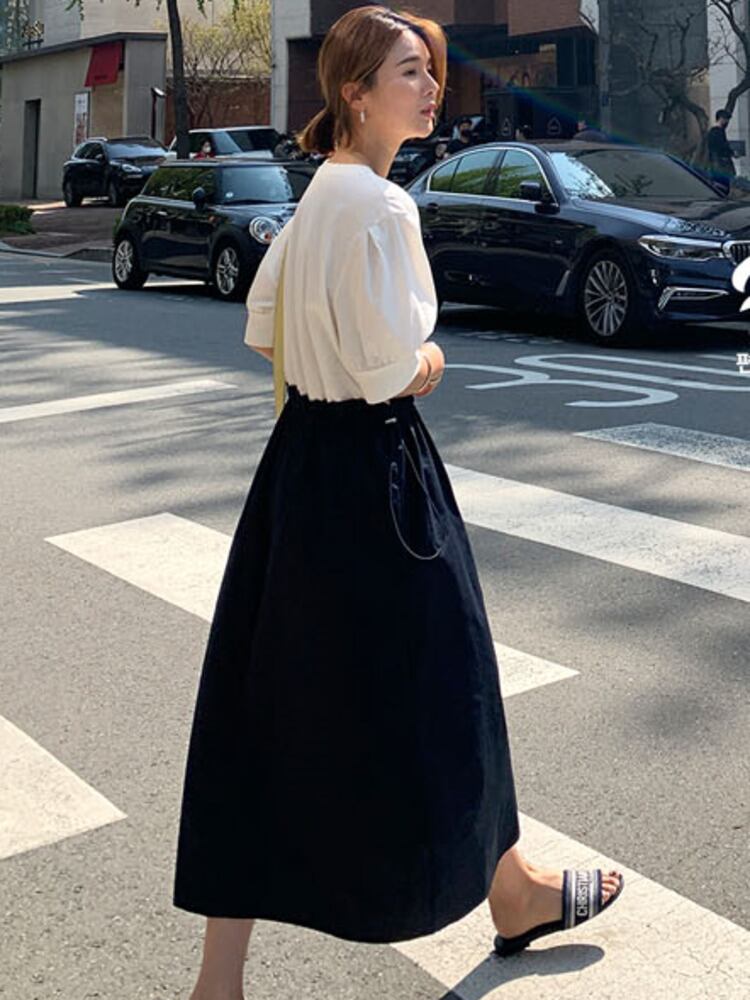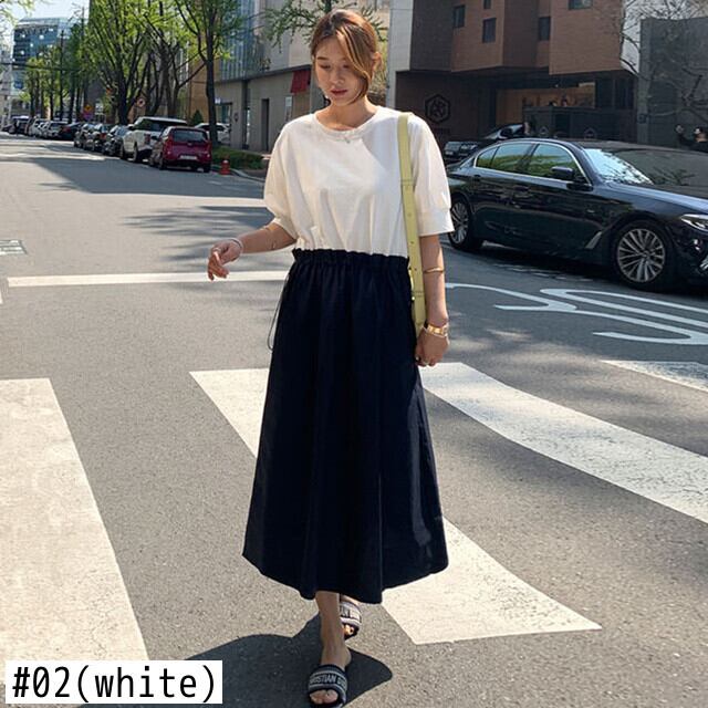 [EWQ] スプライシングフェイクツーピース巾着ドレスコントラストカラー半袖ドレス夏潮オールマッチ服 ショート ハーフスリーブ サマー 夏物