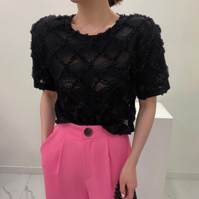 [EWQ] レースダイヤチェック Oネックシャツ レディース 半袖 無地 ブラウス トップス サマータイドトップス 6Y8300 ショート レッド ハーフスリーブ 夏物 ソリッドカラー