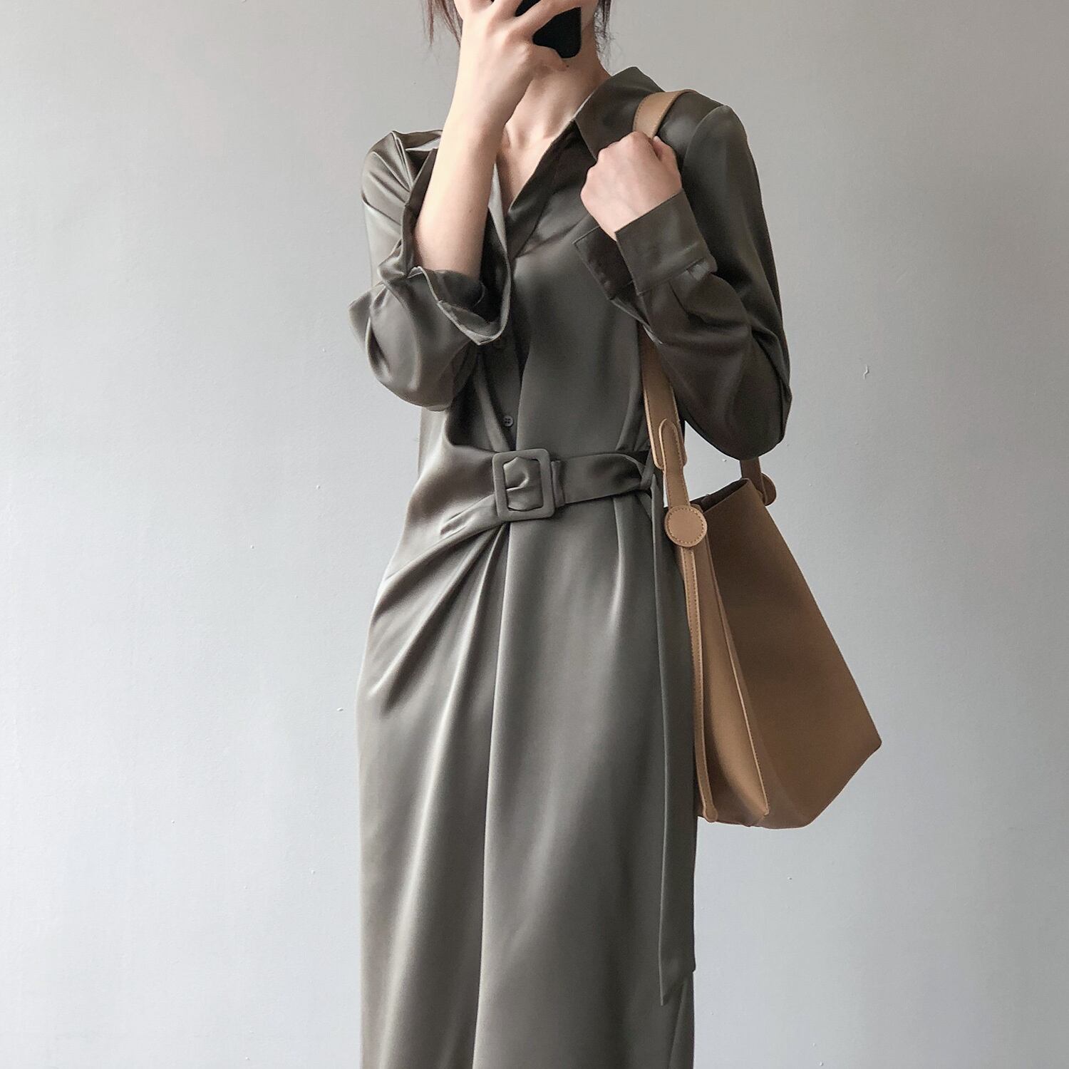 [EWQ] 長袖ブレットシャツ A ラインドレス春秋潮ターンダウン襟ドレス Vestido パーティーローブ 16Y5969 ロング スプリング 春物 オータム 秋物 Aライン