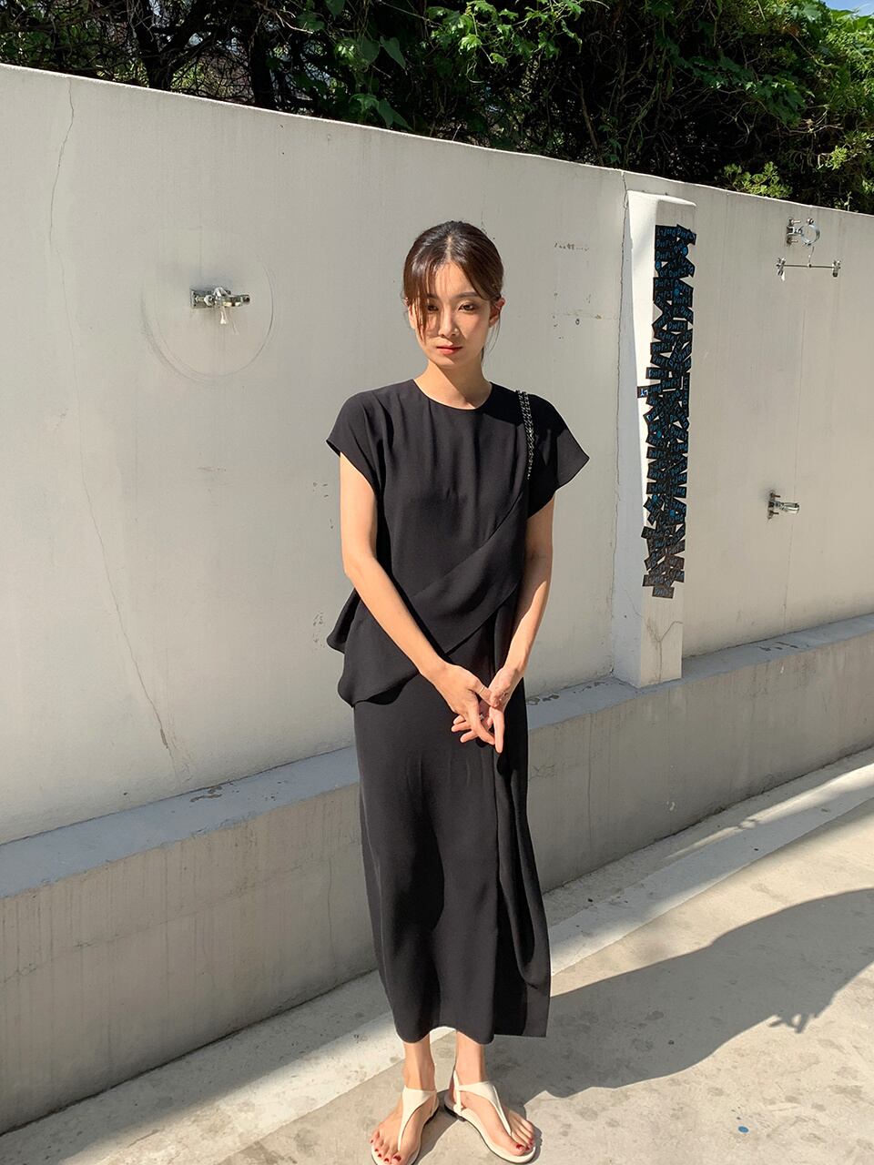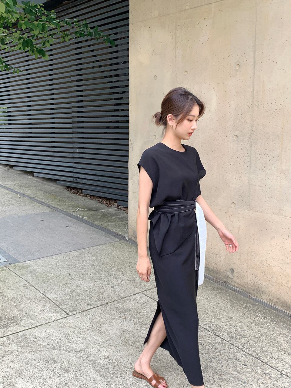 [EWQ] フリルスプライスレースアップドレス O ネック半袖コントラストドレス夏潮ローブ ショート ハーフスリーブ サマー 夏物 Oネック