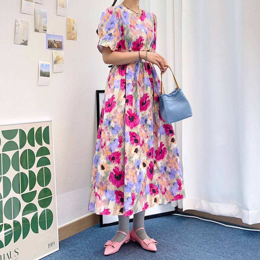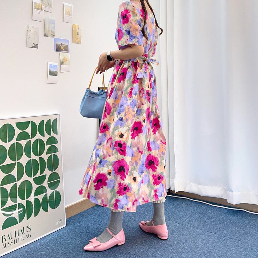 [EWQ] 花柄ドレス半袖コントラスト カラー O ネック ドレス夏 Vestido ショート ハーフスリーブ サマー 夏物 Oネック
