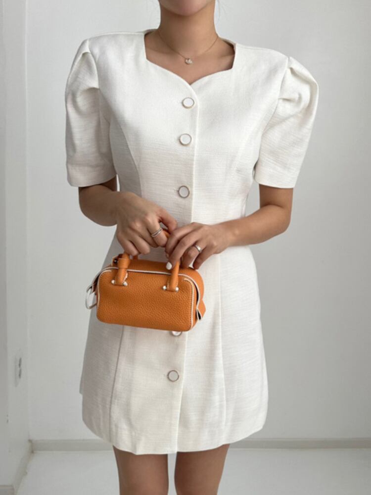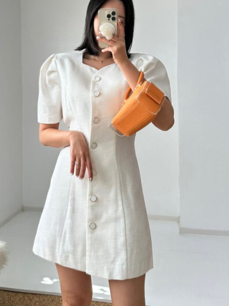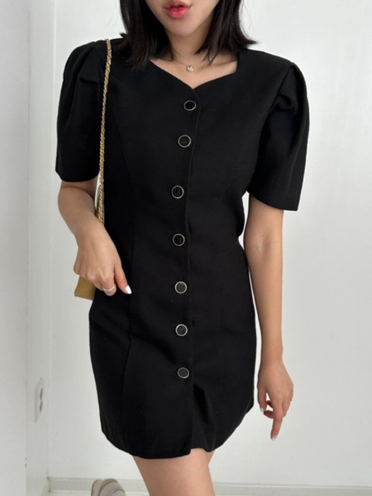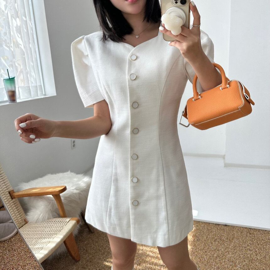 [EWQ] シングル ブレスト ミニ ドレス無地パフ スリーブ ドレス夏潮 Vestido 6Y8493 サマー 夏物 ソリッドカラー