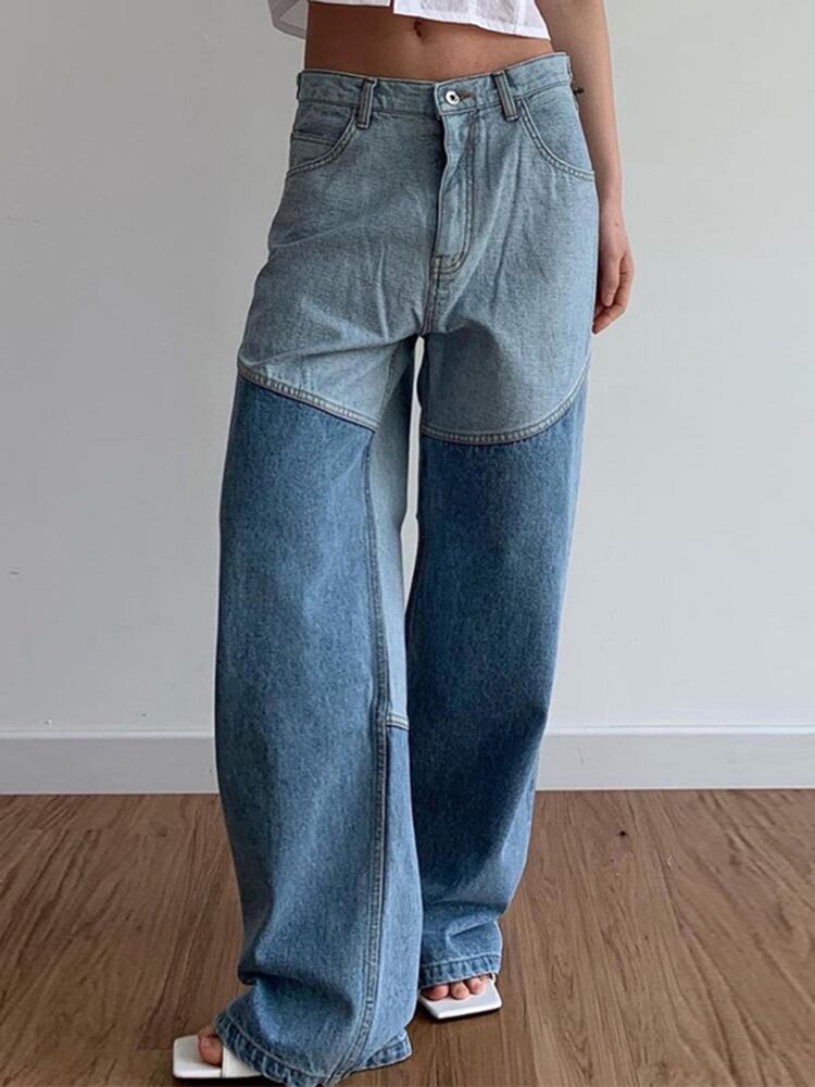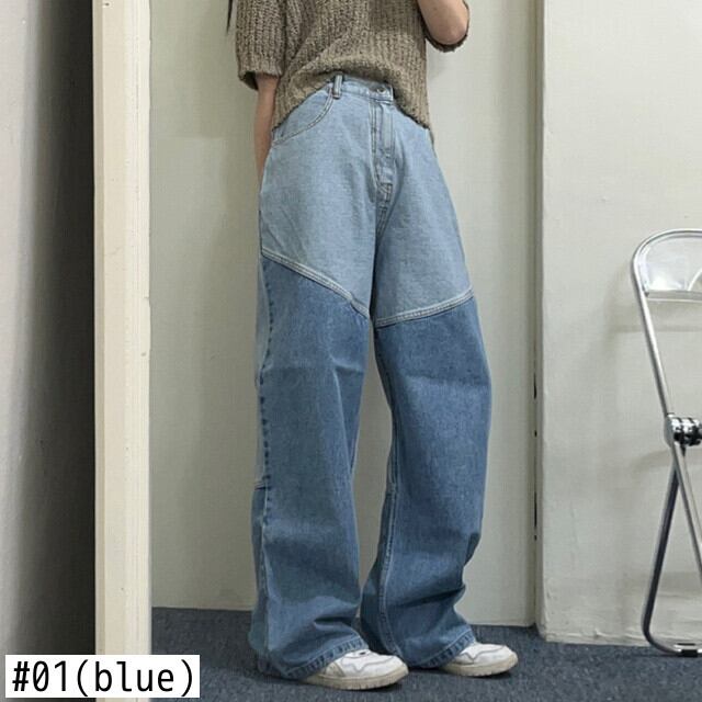 [EWQ] コントラスト ワイドレッグ ジーンズ パッチワーク ストリート ウエスト ポケット デニム パンツ春夏ズボン スプリング 春物 サマー 夏物 ワイドパンツ