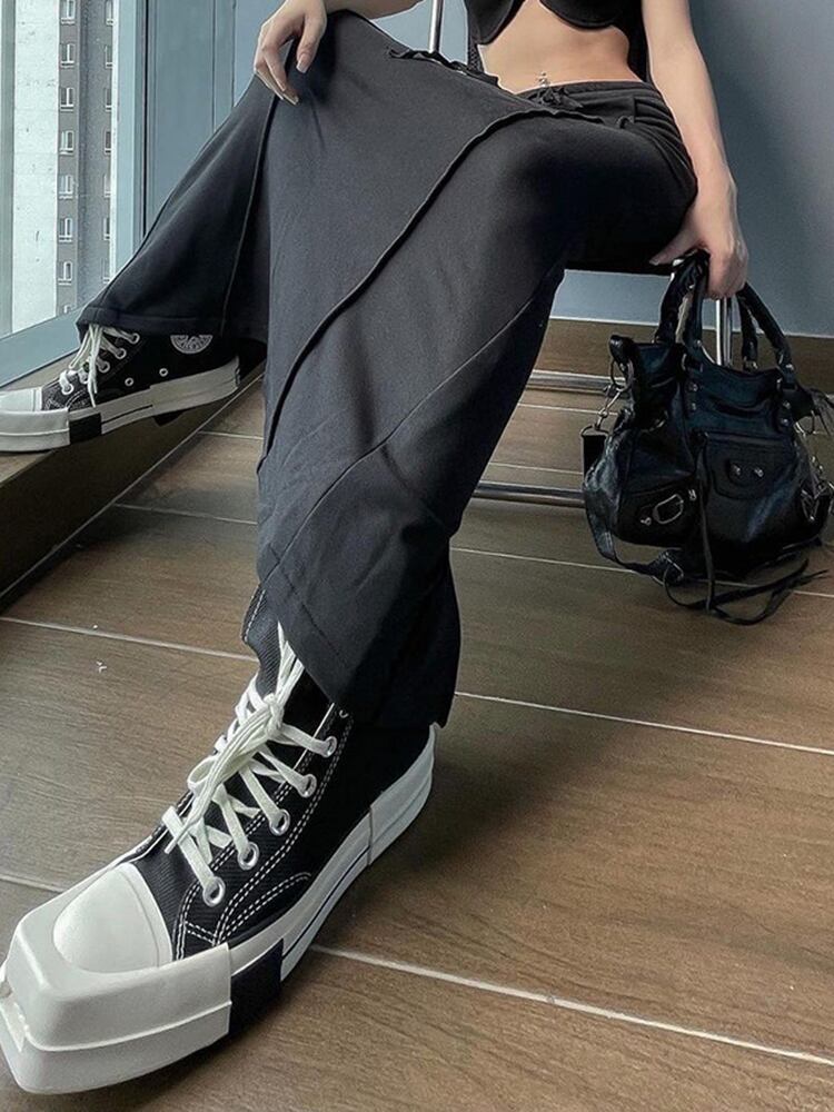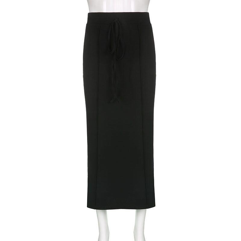 [EWQ] 巾着 A ライン スカート黒ウエスト ストリート ミッドカーフ スカート夏潮 Faldas 16Y8575 ブラック サマー 夏物 Aライン