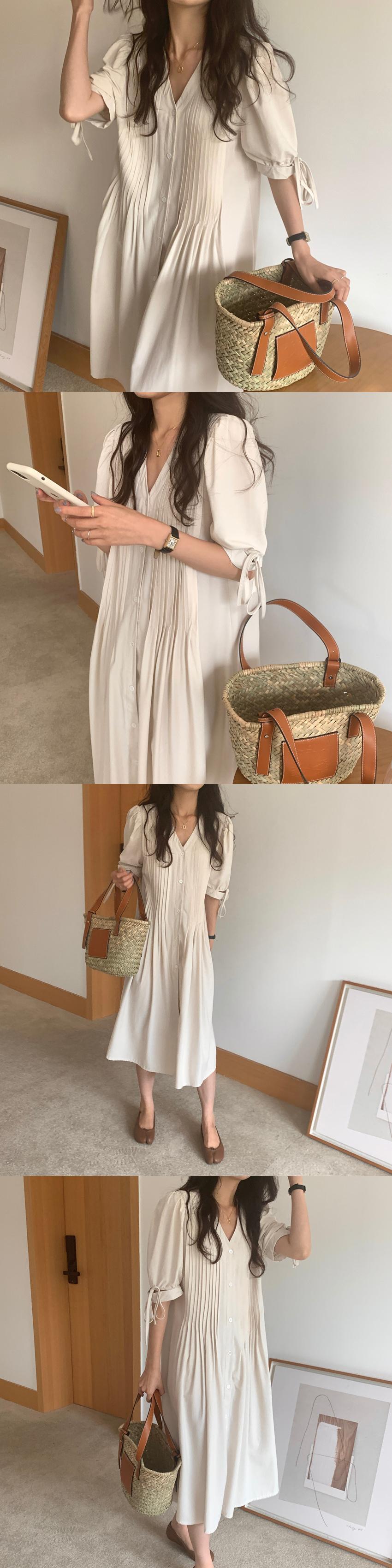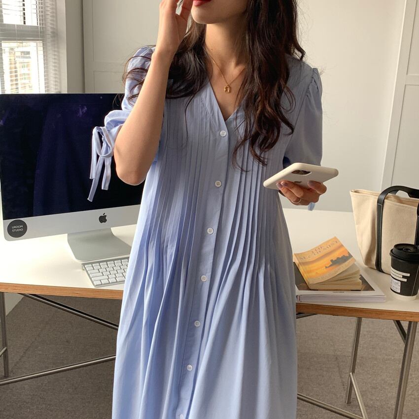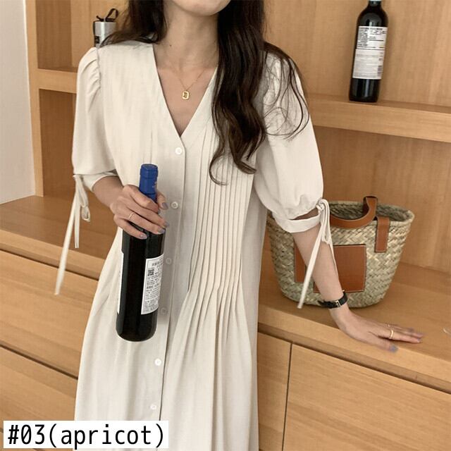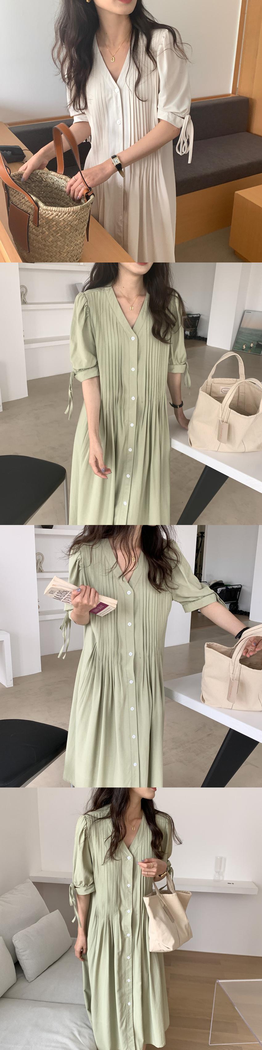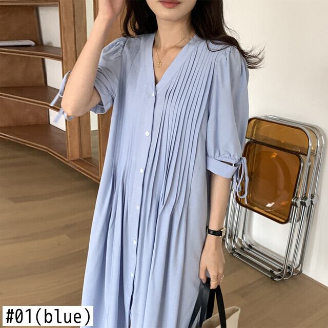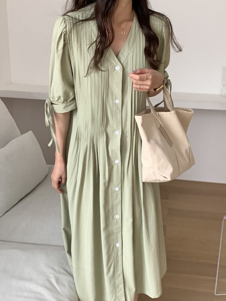 [EWQ] グリーン パフ スリーブ レースアップ ドレス プリーツ ルーズ 因果シングル ブレスト ドレス夏潮 Vestidos サマー 夏物