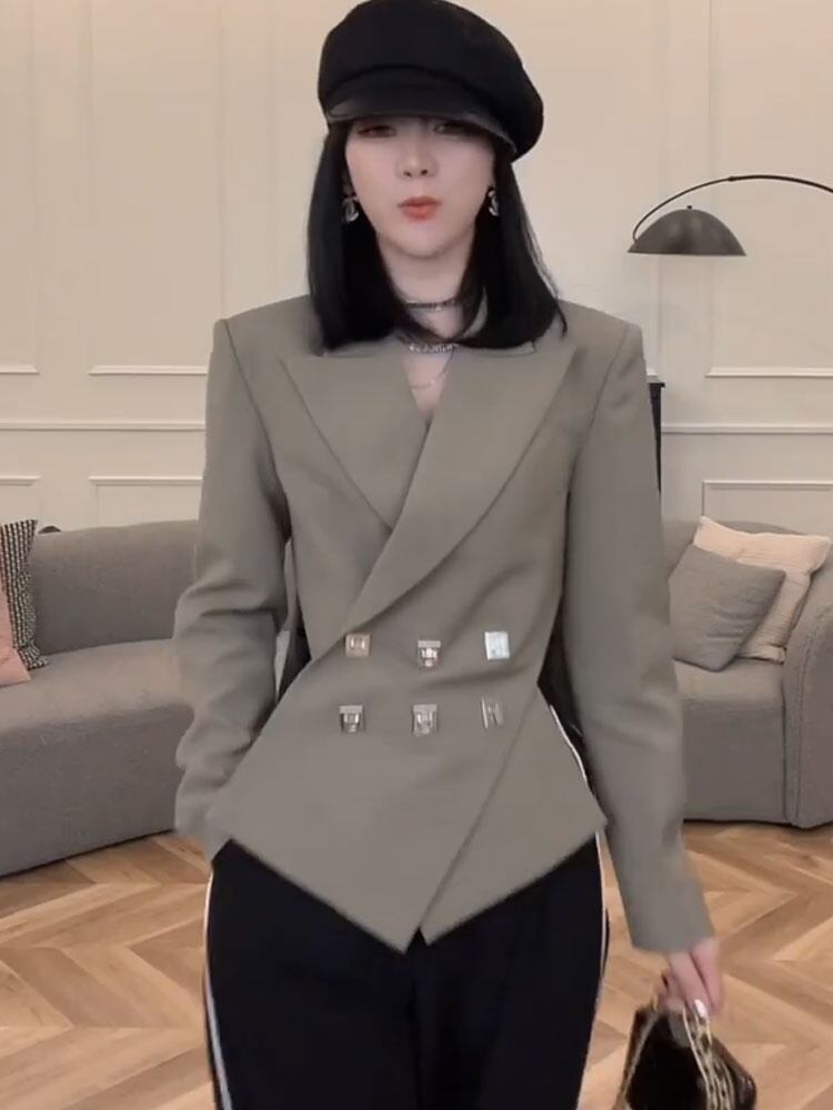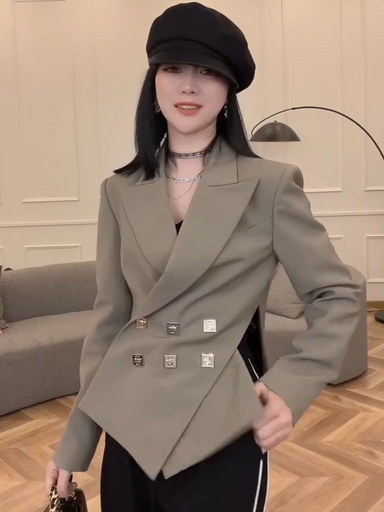 【EWQ】長袖OL美人ブレザー秋新作ダブルブレストカーキコート16R3061 ロング オータム 秋物 会社 学校 通勤や通学にも