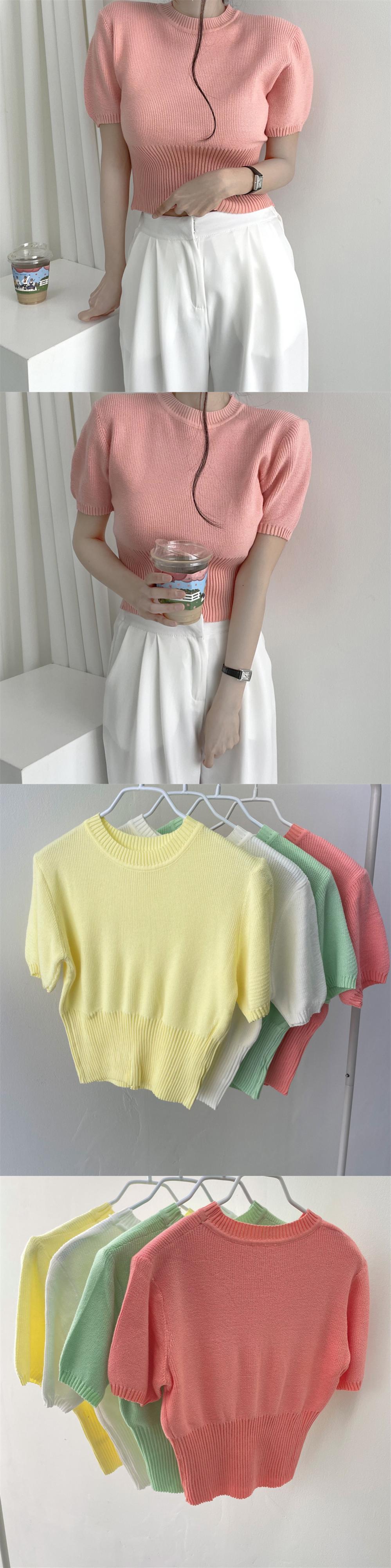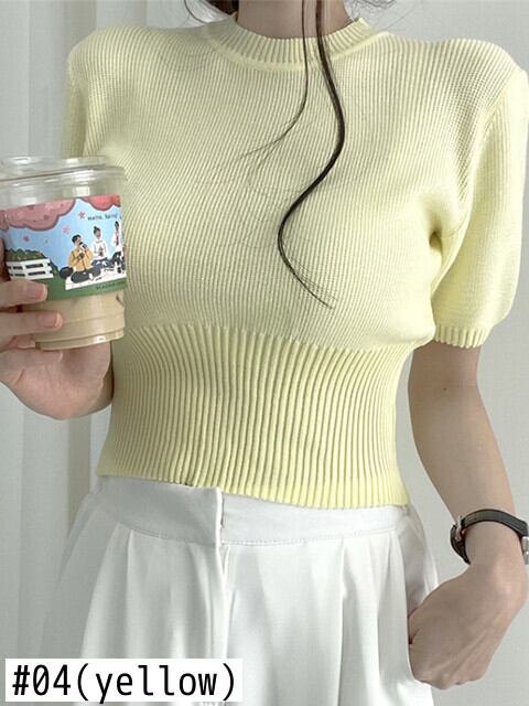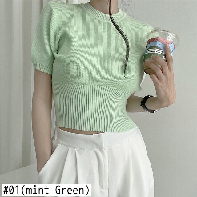 [EWQ] グリーンニット Tシャツパフスリーブ因果スリムフィット O ネック弾性ニット Tシャツトップ夏潮 Tシャツ エラスティック 伸縮 サマー 夏物 Oネック