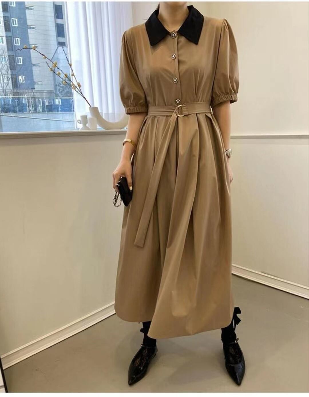 [EWQ] ラペル コントラスト レースアップ ウエスト ドレス パフ スリーブ 因果シングル ブレスト カーキ ロング ドレス夏潮 Vestido サマー 夏物