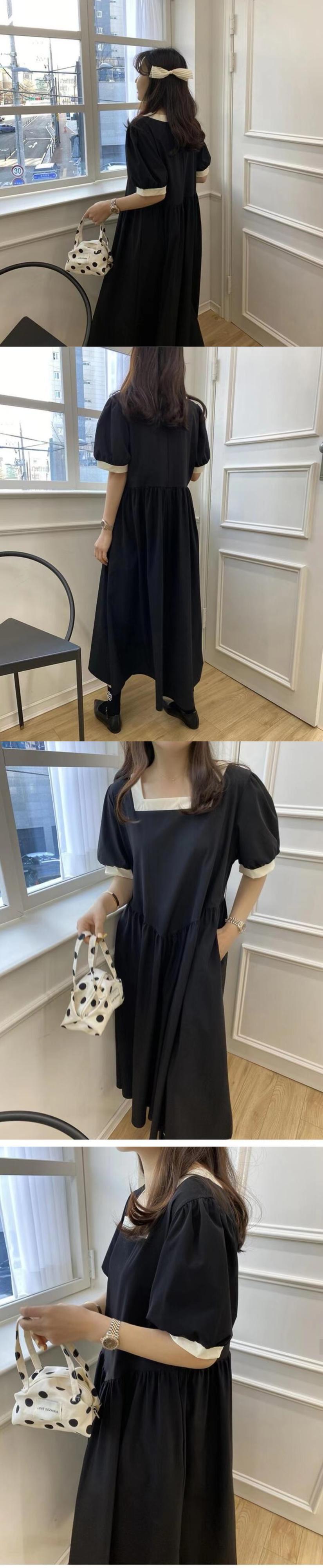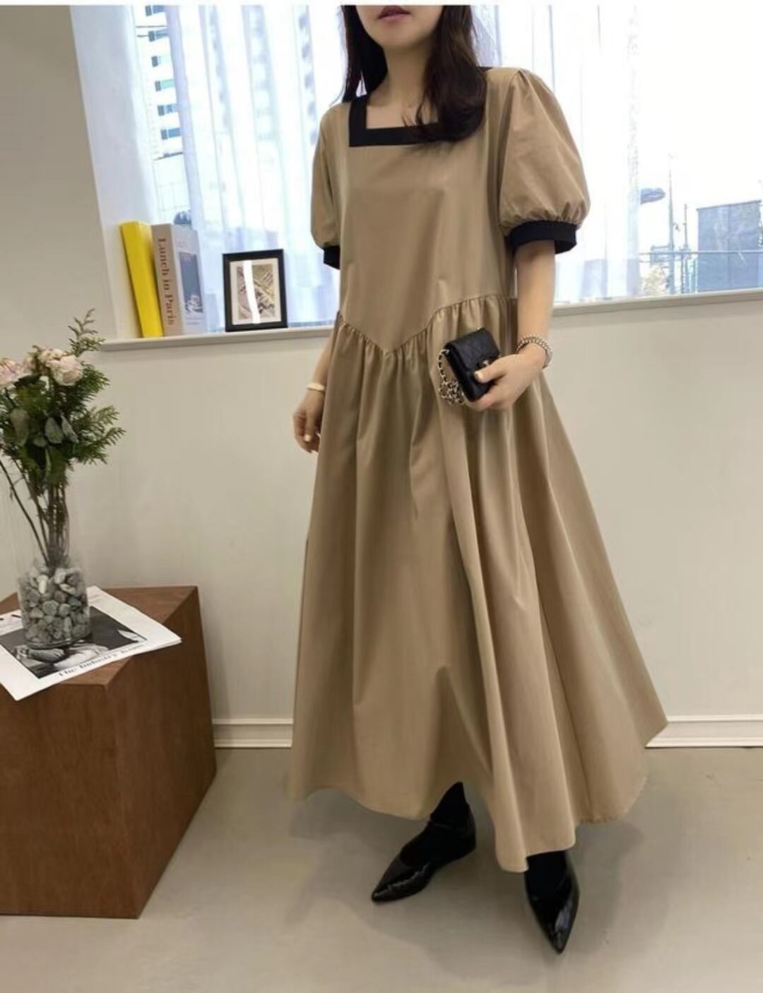 【EWQ】レディース スクエアネック カラーブロック ドレス 半袖 ルーズ カジュアル ドレス サマータイド Vestido 6Y8638 ショート ハーフスリーブ 夏物 スクウェア