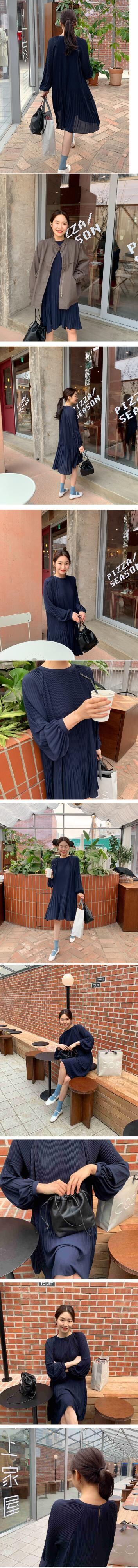 【EWQ】シック シンプル ラウンドネック 無地 ゆったり ミディアム丈 ロングスリーブ プリーツワンピース 春夏 16W2492 長袖 スプリング 春物 サマー 夏物 Oネック ソリッドカラー