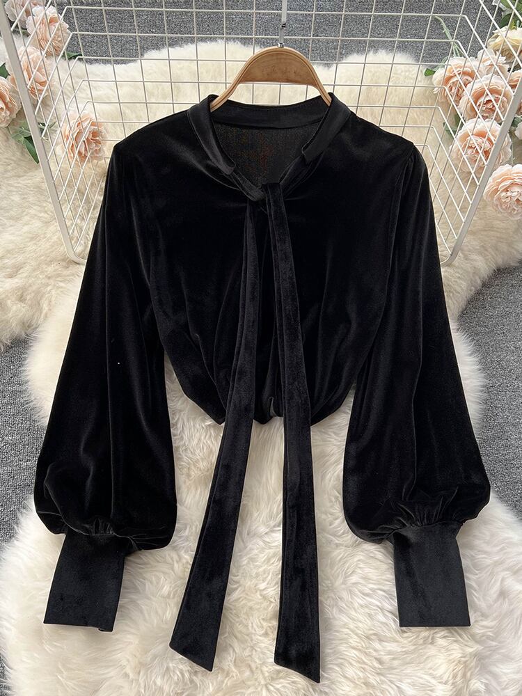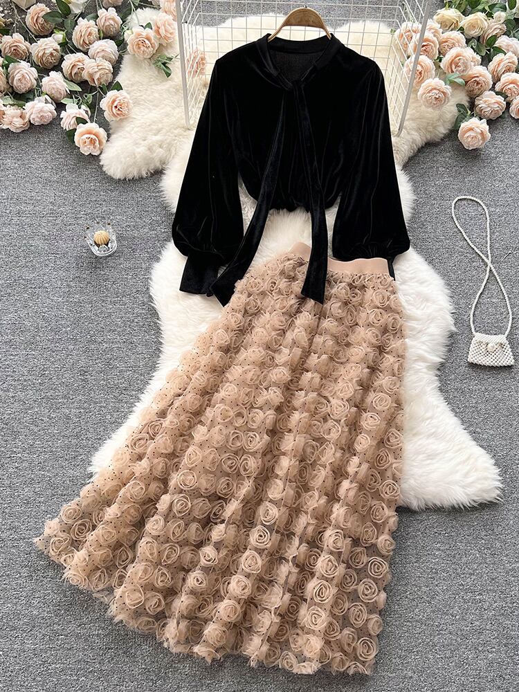 【EWQ】立体フラワーウエストスリムスカート+ゆったりパフスリーブベルベットシャツ春 16R1831 スプリング 春物 フラワーデザイン