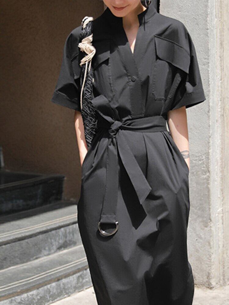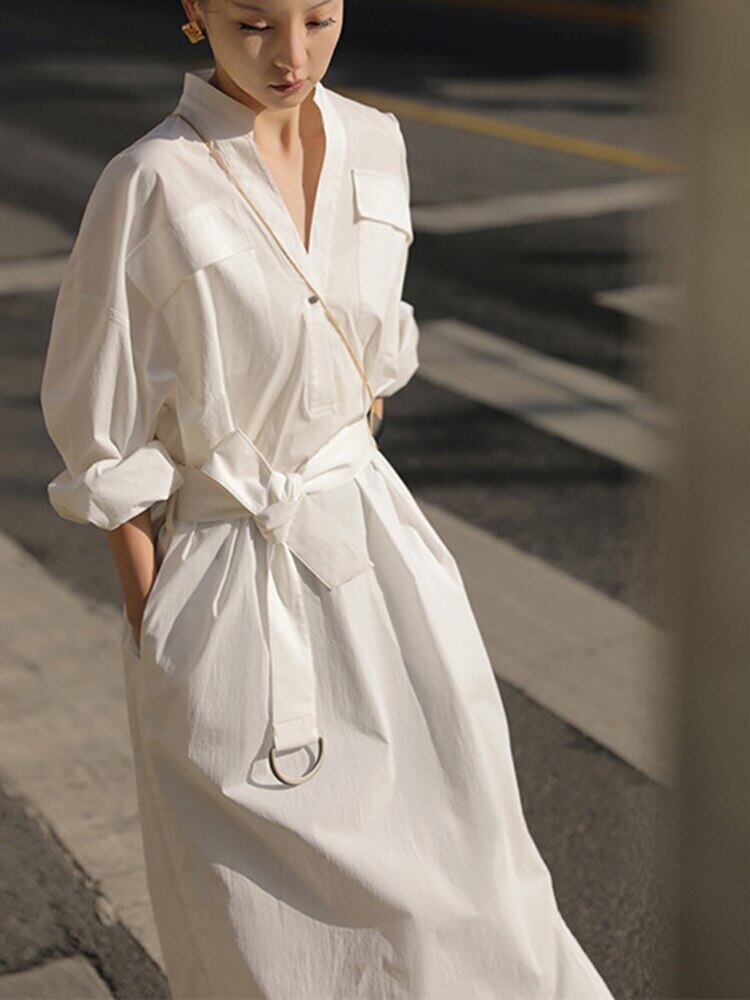 [EWQ] シングルブレストシャツドレス長袖メタルバックルドレス春潮ポケット Vestido 692 ロング スプリング 春物