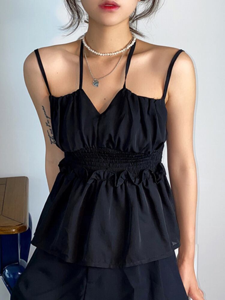 [EWQ] ホルターオフショルダータンクトップ弾性プリーツウエストフリルスプライスベスト夏潮無地トップ 16Y8389 エラスティック 伸縮 サマー 夏物 ソリッドカラー