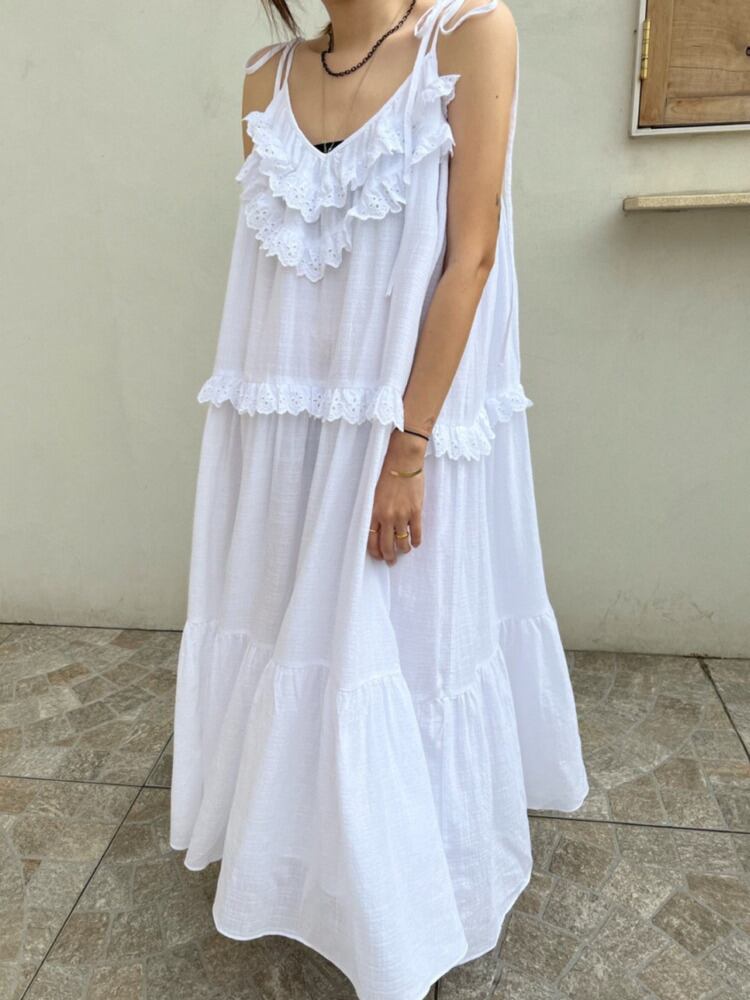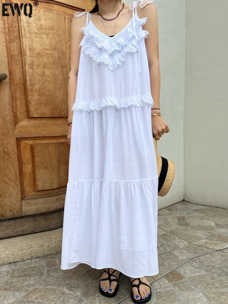 [EWQ] フック フラワー スプライス フリル スリング ドレス ルーズ 因果 ノースリーブ 無地 ロング ドレス 夏 潮 Vestido サマー 夏物 ソリッドカラー フラワーデザイン