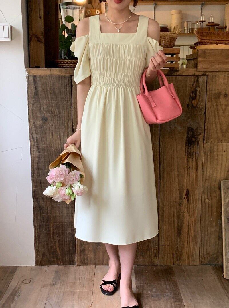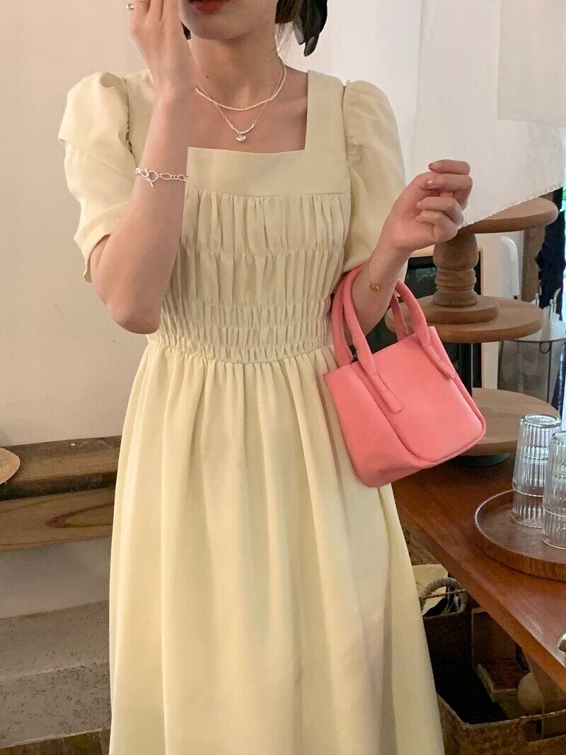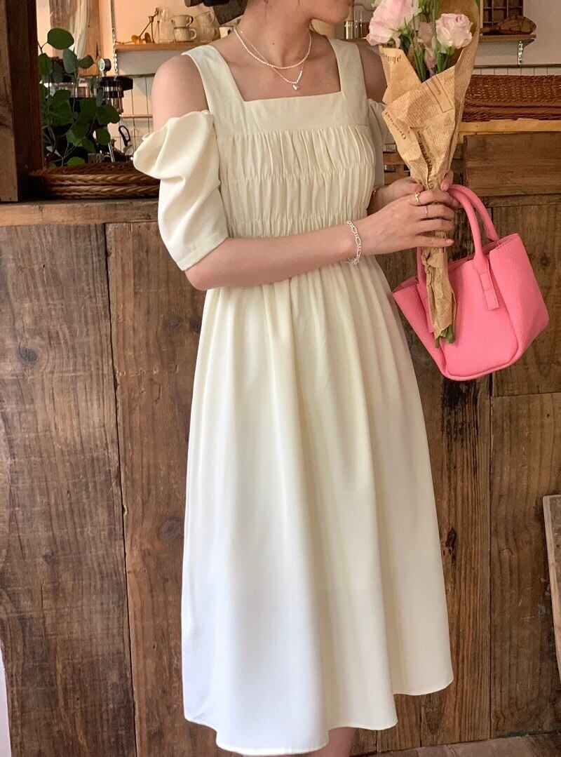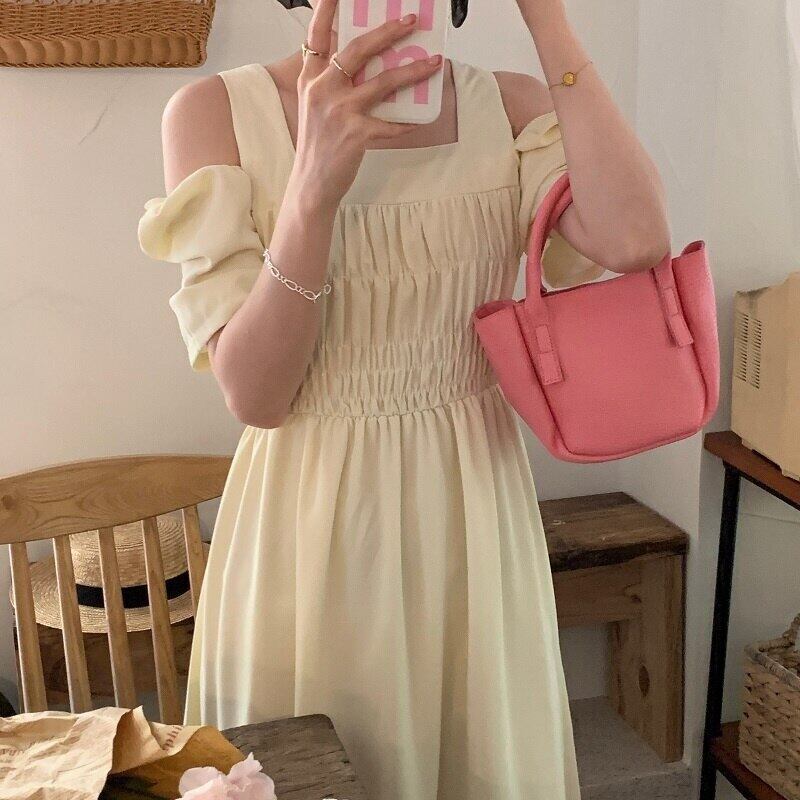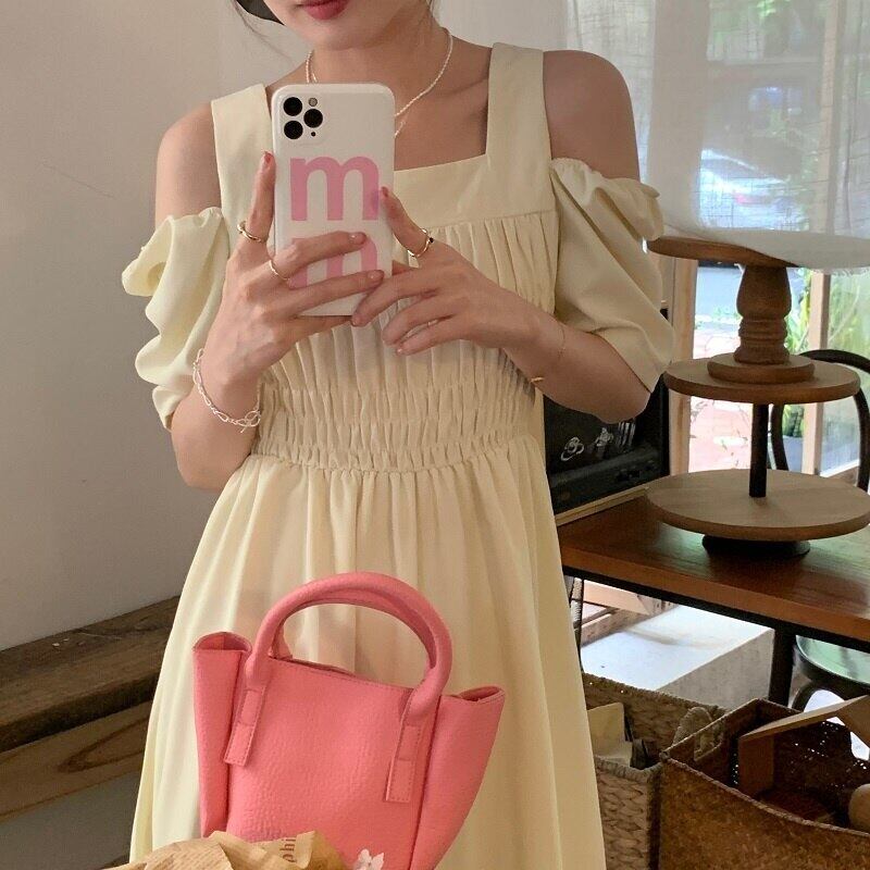 [EWQ] スクエアネック オフショルダー 2着 ワンピース 夏 潮 ウエストゴム プリーツワンピース 優しい気質ローブ エラスティック 伸縮 サマー 夏物 ドレス スクウェア