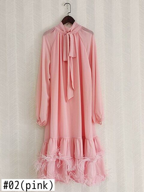 [EWQ] ピンク羽レースアップ ドレス長袖フリルスプライシング無地イブニング ドレス春 Vestido ロング スプリング 春物 ソリッドカラー