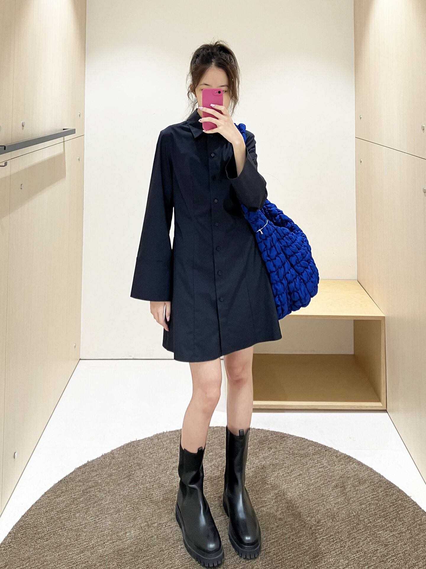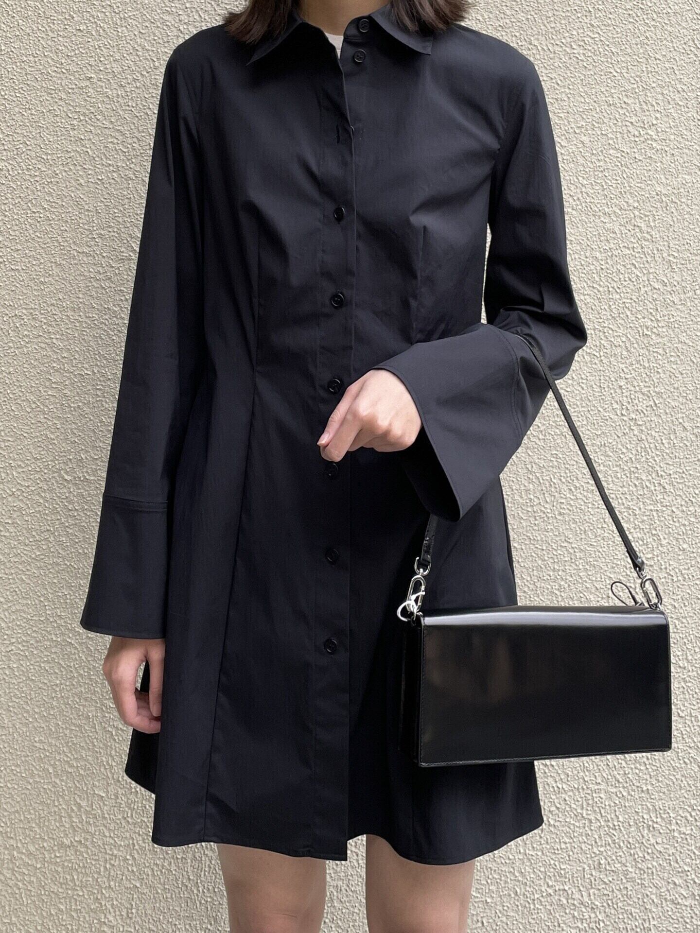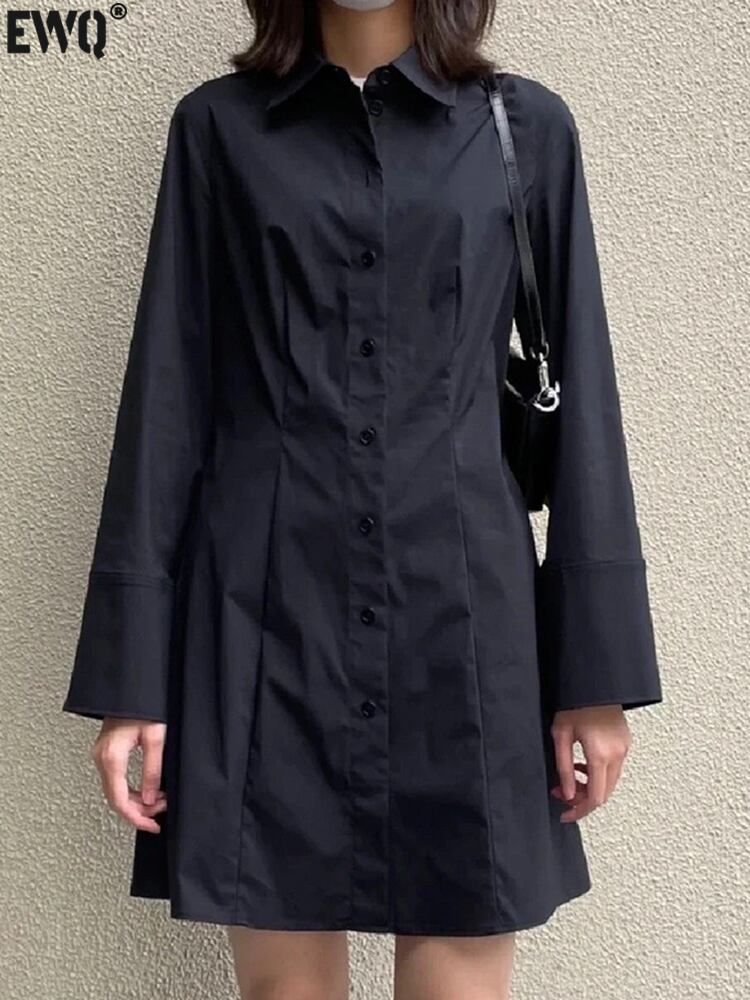 [EWQ] 黒シングル ブレスト シャツ ドレス長袖因果ラペル ミニ ドレス春潮 Vestido ロング ブラック スプリング 春物