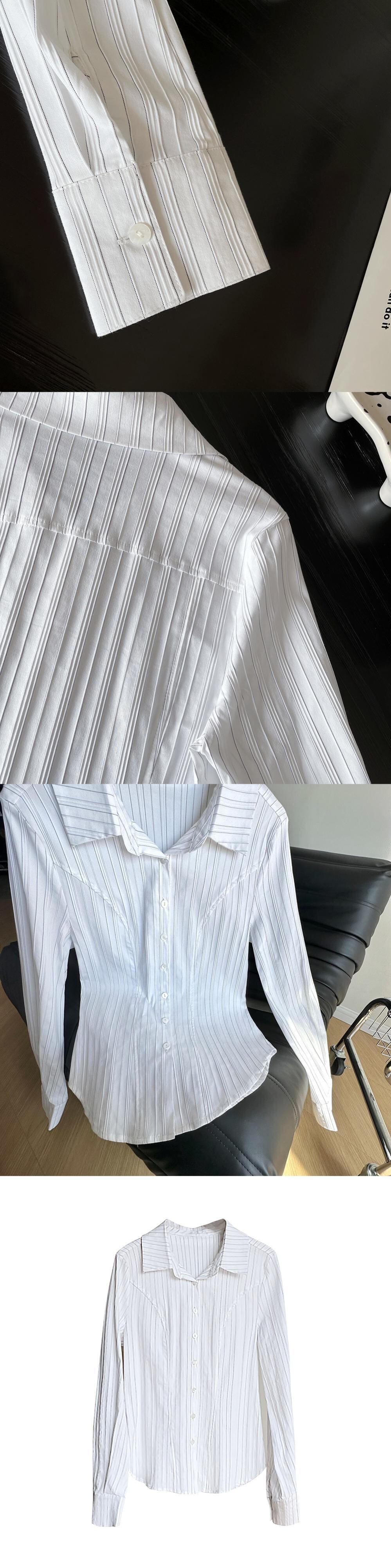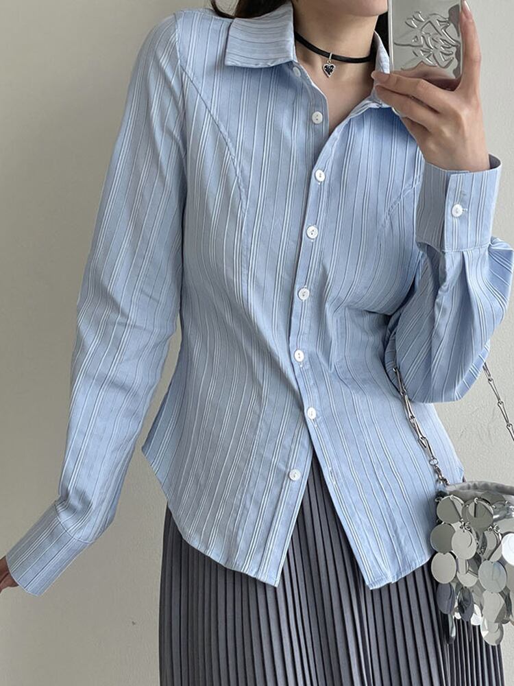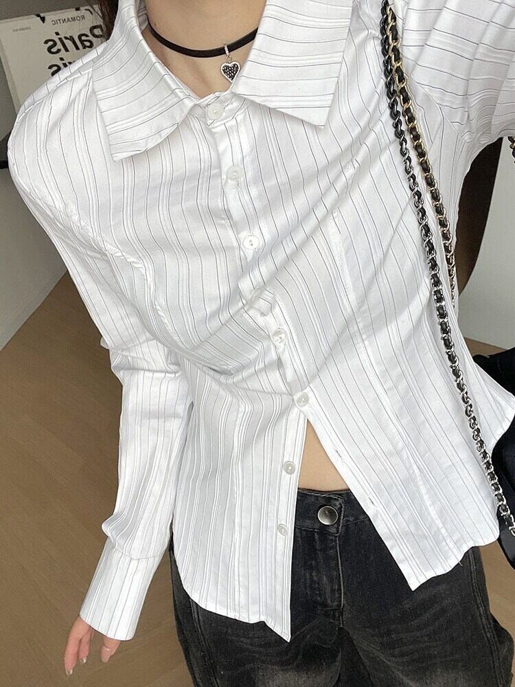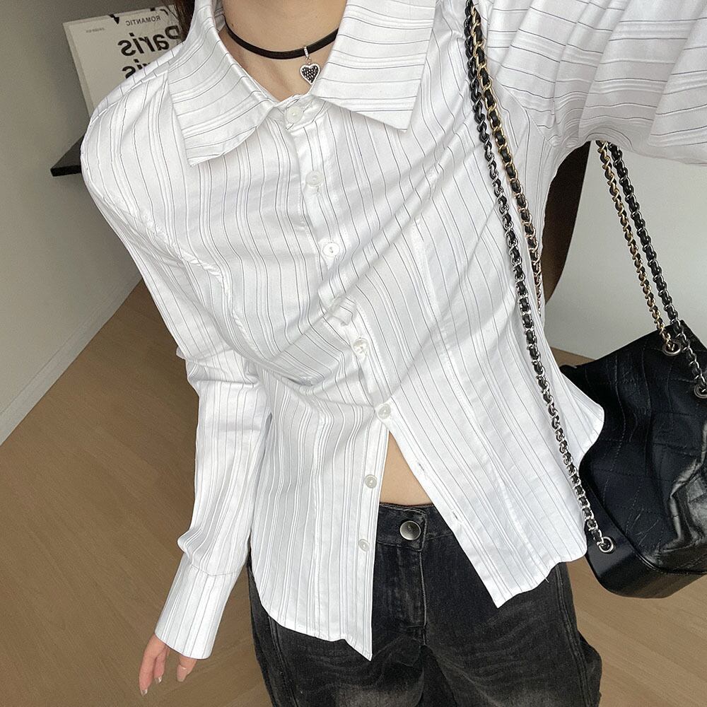 【EWQ】ストライプ長袖シャツ レディース スリムフィット コントラストカラー シングルブレスト ブラウス 春潮 トップス ロング スプリング 春物