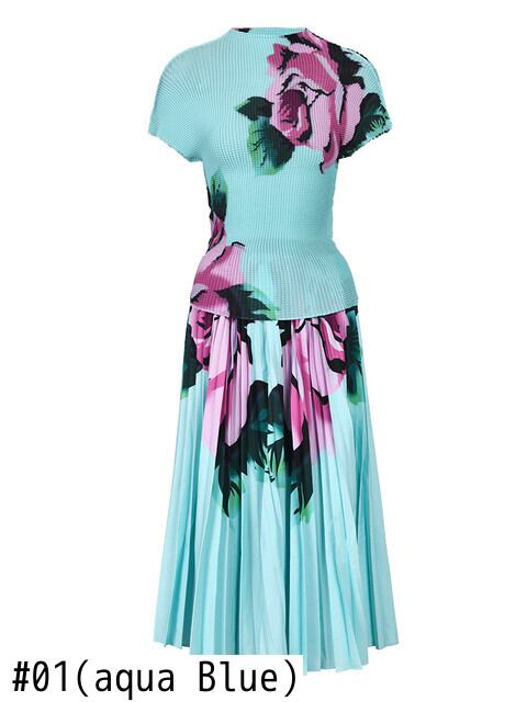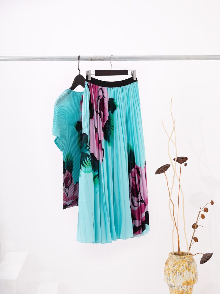 [EWQ] 弾性プリーツ スリム フィット プリント トップ 2 ピース スーツ ウエスト コントラスト ミッドカーフ スカート サマー タイド パーティー セット エラスティック 伸縮 夏物