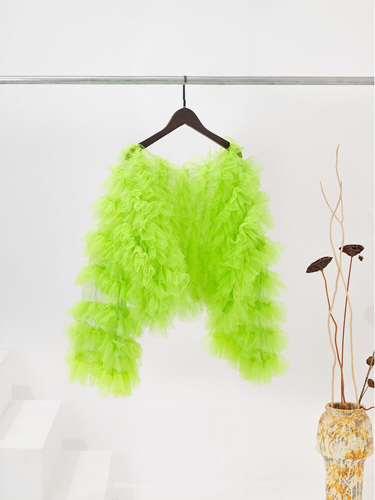 [EWQ] ティアード メッシュ スプライス シャツ長袖グリーン O ネック ブラウス トップ夏潮優しい気質トップス ロング レッド サマー 夏物 Oネック