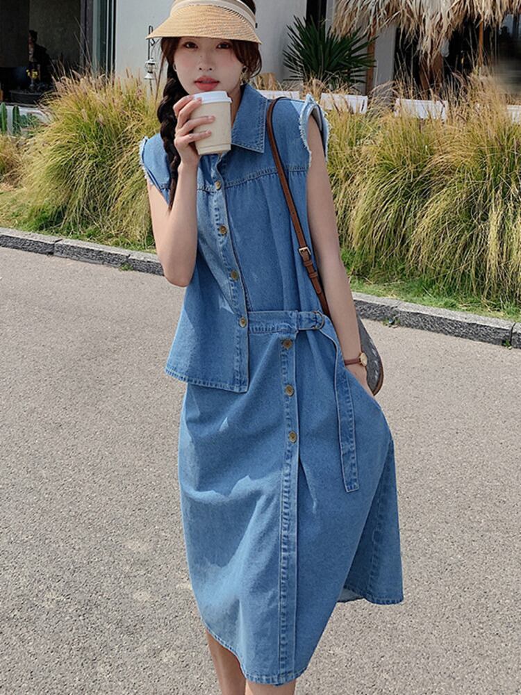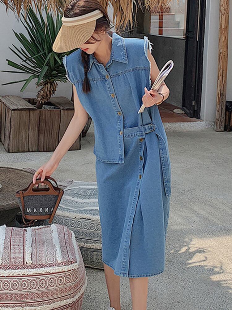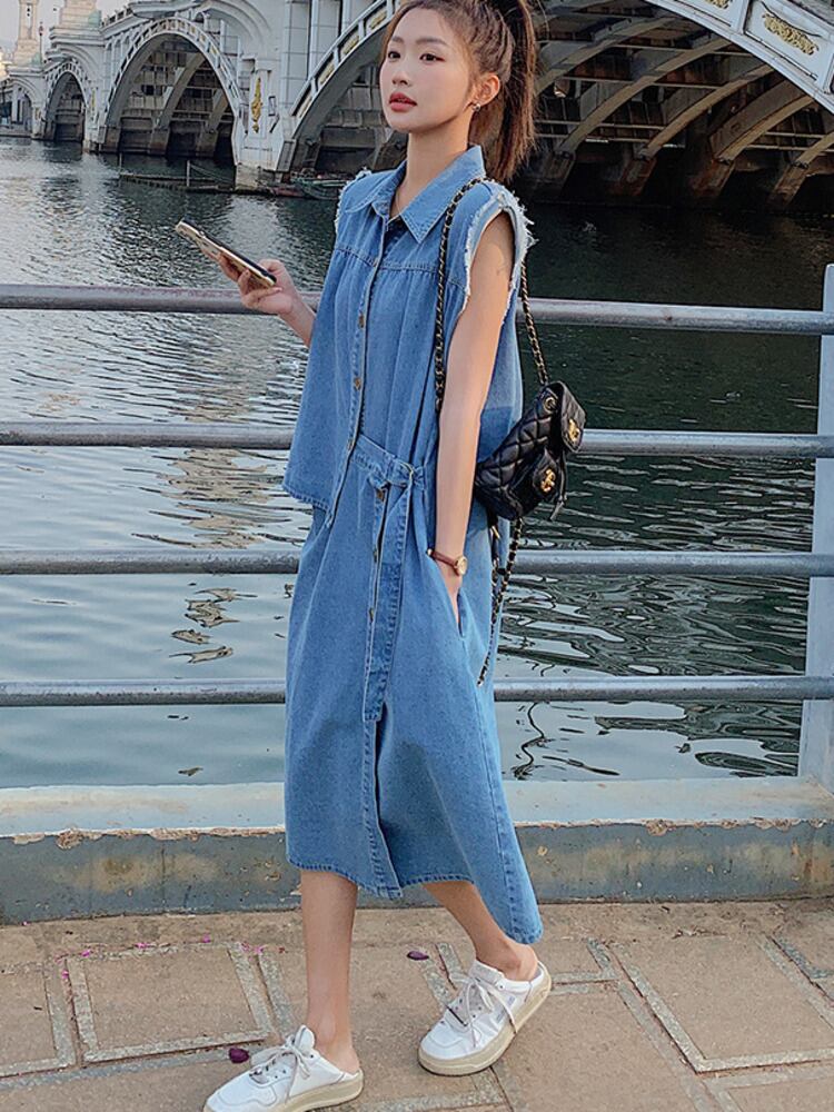 【EWQ】イレギュラーバンデージデニムワンピースノースリーブパッチワーク無地シングルブレストワンピースサマータイドVestido 夏物 ドレス ソリッドカラー