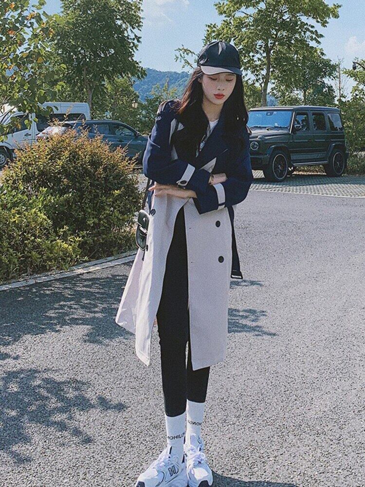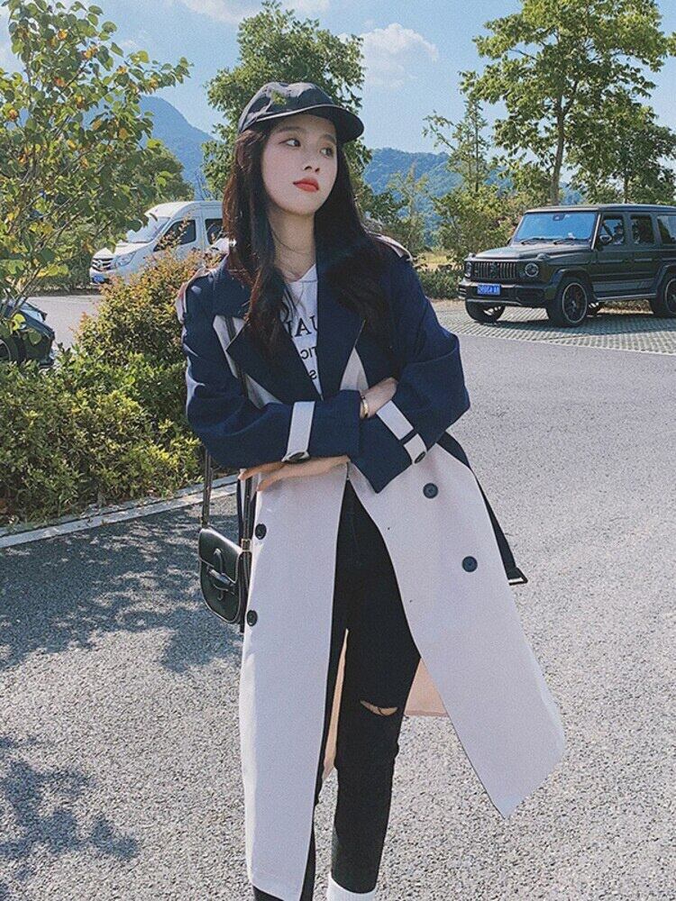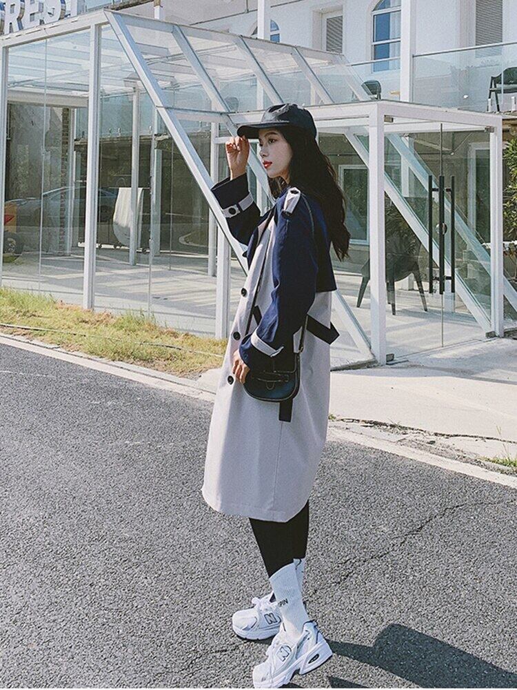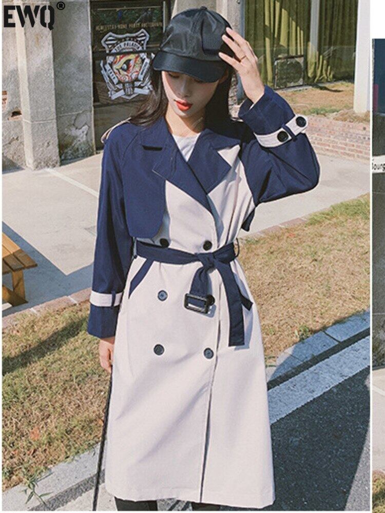 [EWQ] カラーコントラストパッチワークウインドブレーカーコート春秋潮ベルトダブルブレストトレンチコート 16Y591 スプリング 春物 オータム 秋物 ハーネス