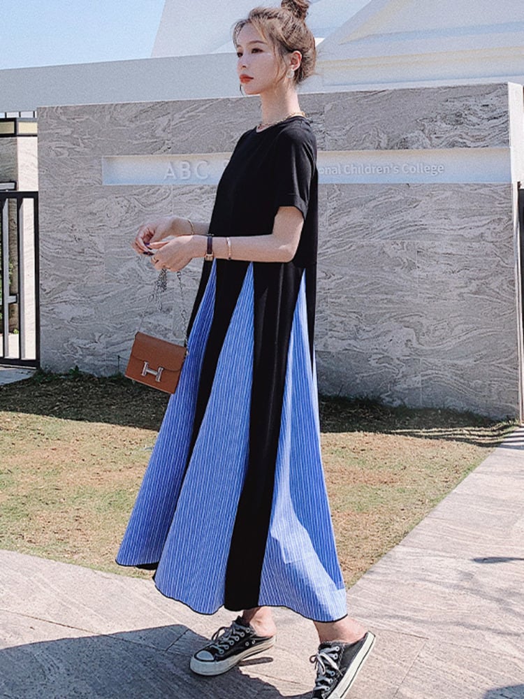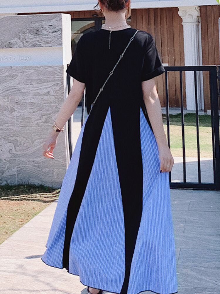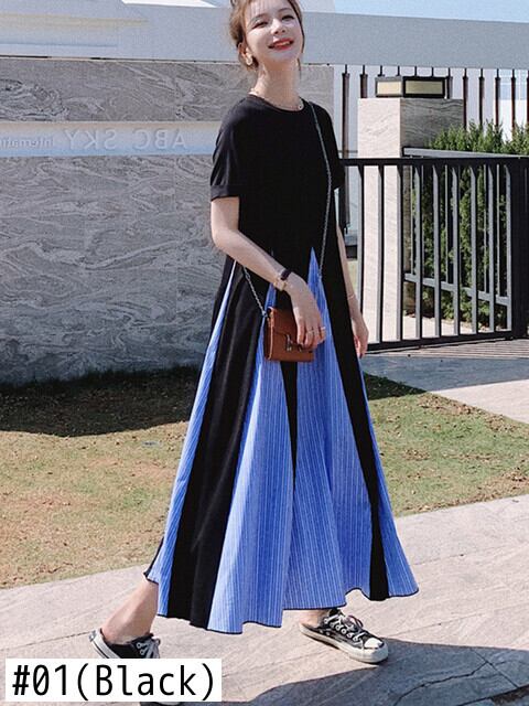 [EWQ] レディース ストライプ コントラストカラー ドレス パッチワーク 半袖 Oネック ドレス 夏潮 Vestido Y8563 ショート ハーフスリーブ サマー 夏物