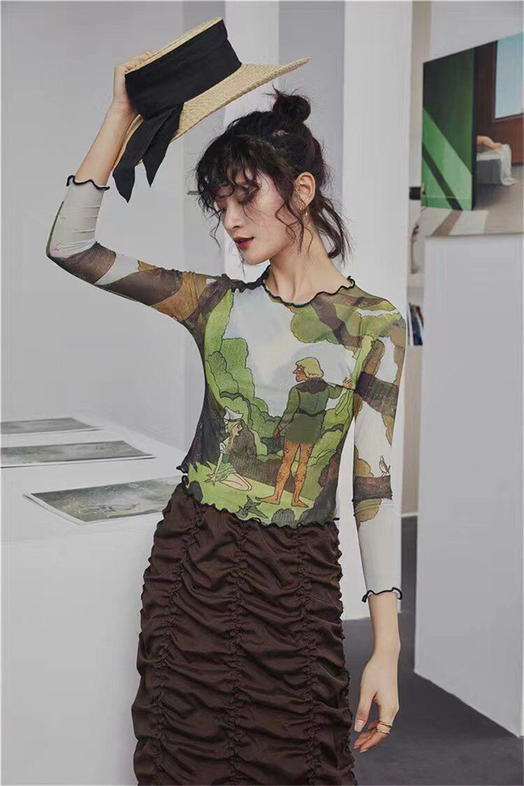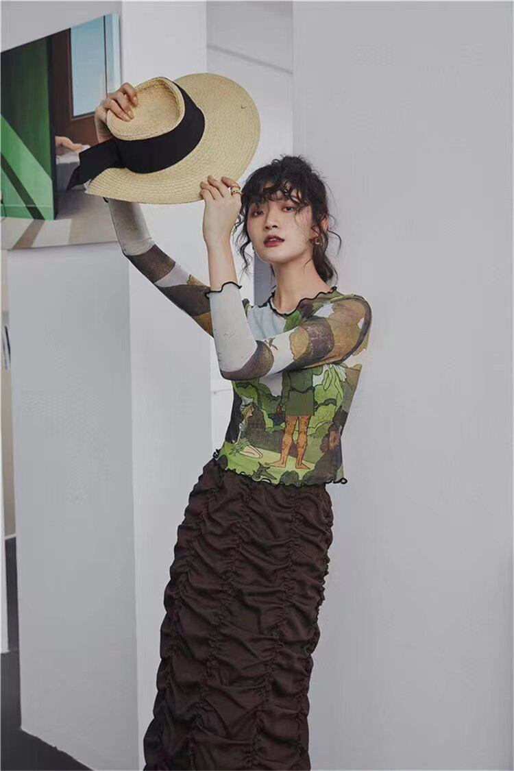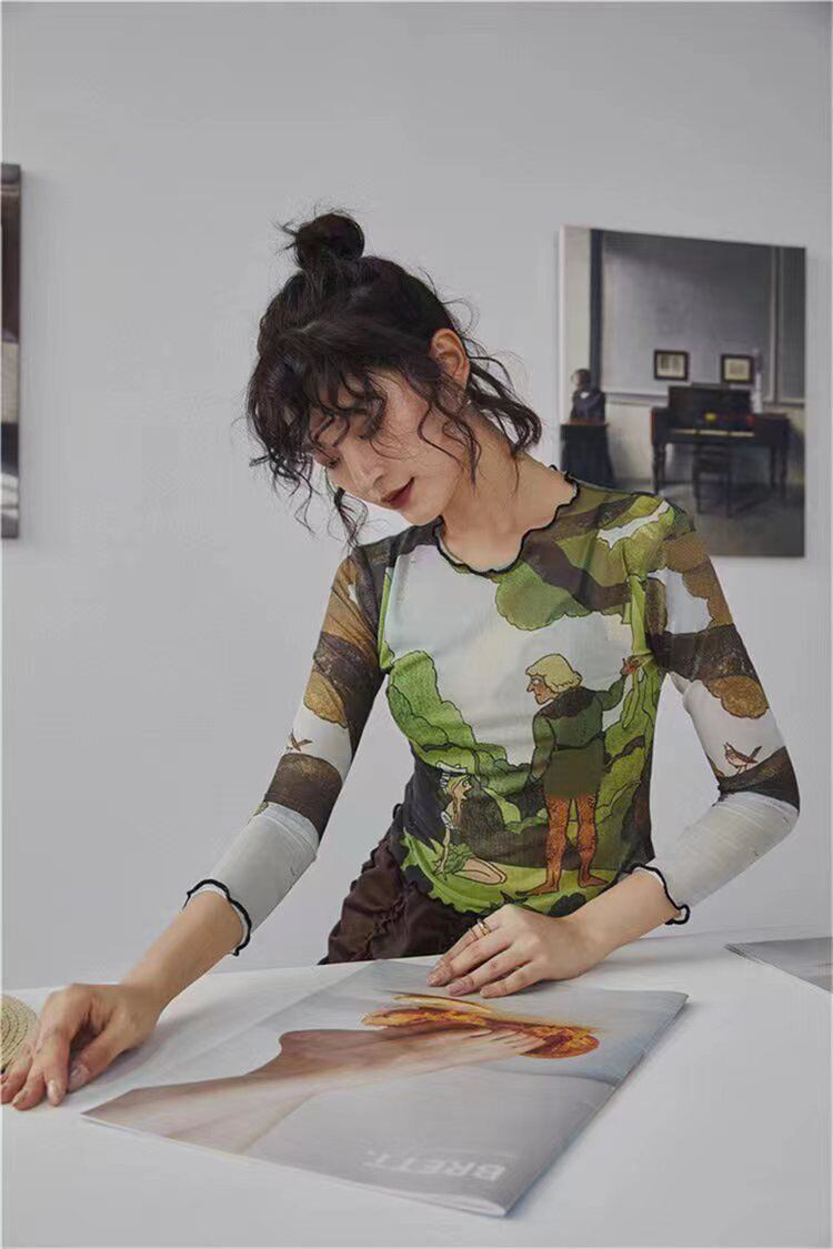 [EWQ] コントラストプリント Tシャツ長袖スリムフィットコントラストカラーメッシュ Tシャツトップ夏潮 O ネックトップス 16Y8614 ロング サマー 夏物 Oネック
