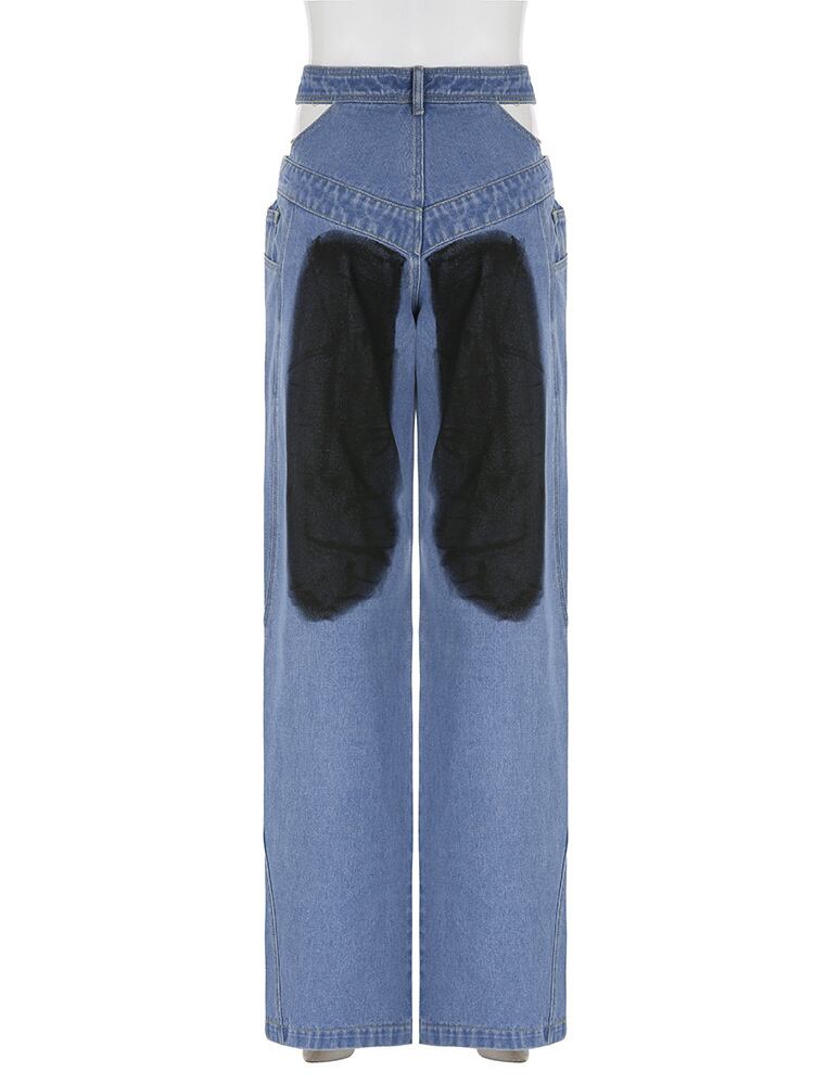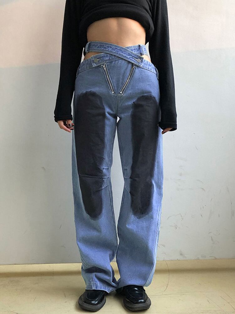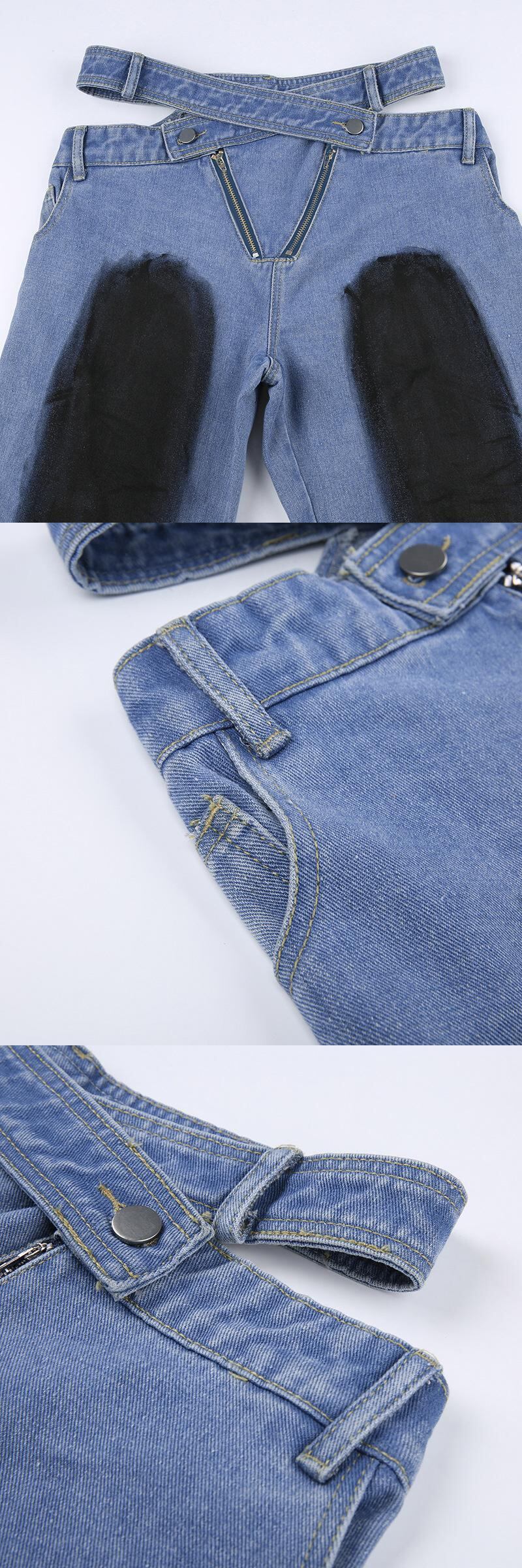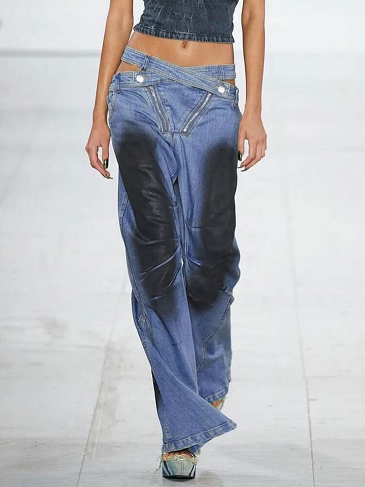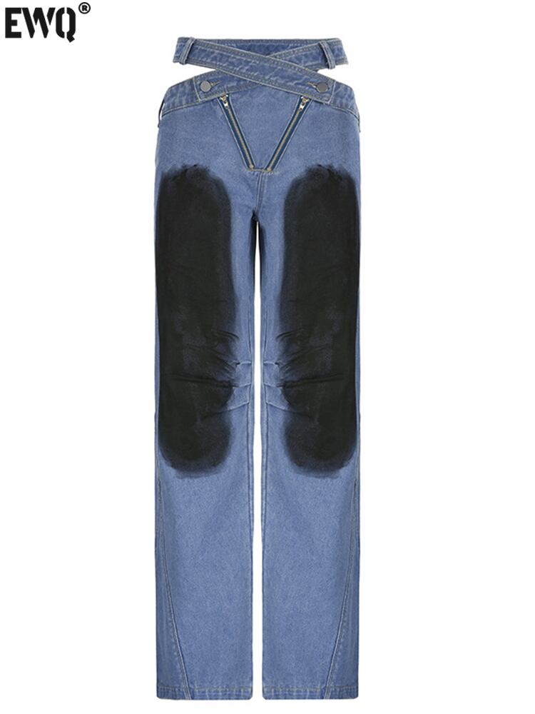[EWQ] ストリート中空アウトジーンズ非対称ローウエストジッパーデニムパンツタイダイパッチワークズボン春潮 スプリング 春物