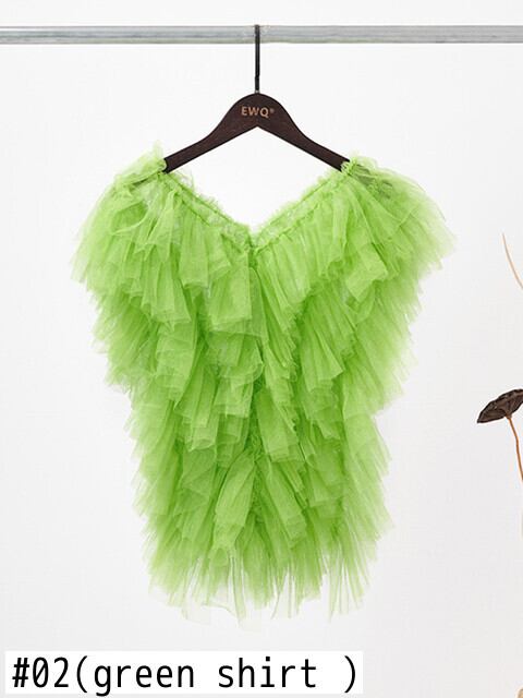 [EWQ] グリーン メッシュ T シャツ + 弾性ウエスト非対称ミッドカーフ スカート ツーピース スーツ夏潮セット エラスティック 伸縮 サマー 夏物 Tシャツ