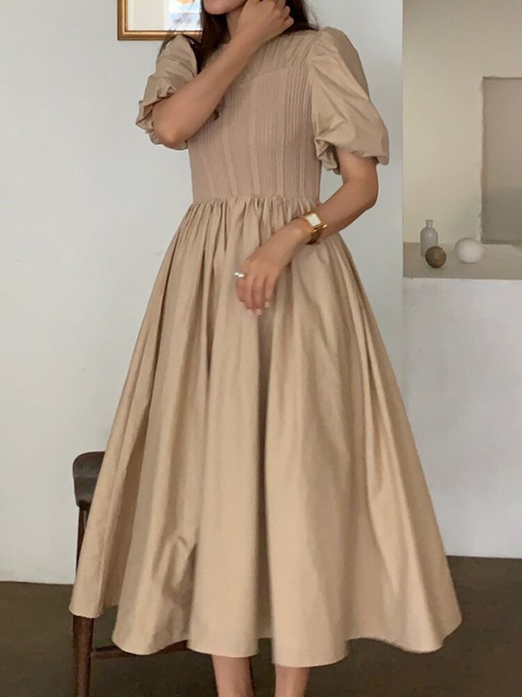 [EWQ] O ネック ニット スプライシング ドレス パフ スリーブ プリーツ ウエスト ドレス サマー Vestido 16Y8203 夏物 Oネック