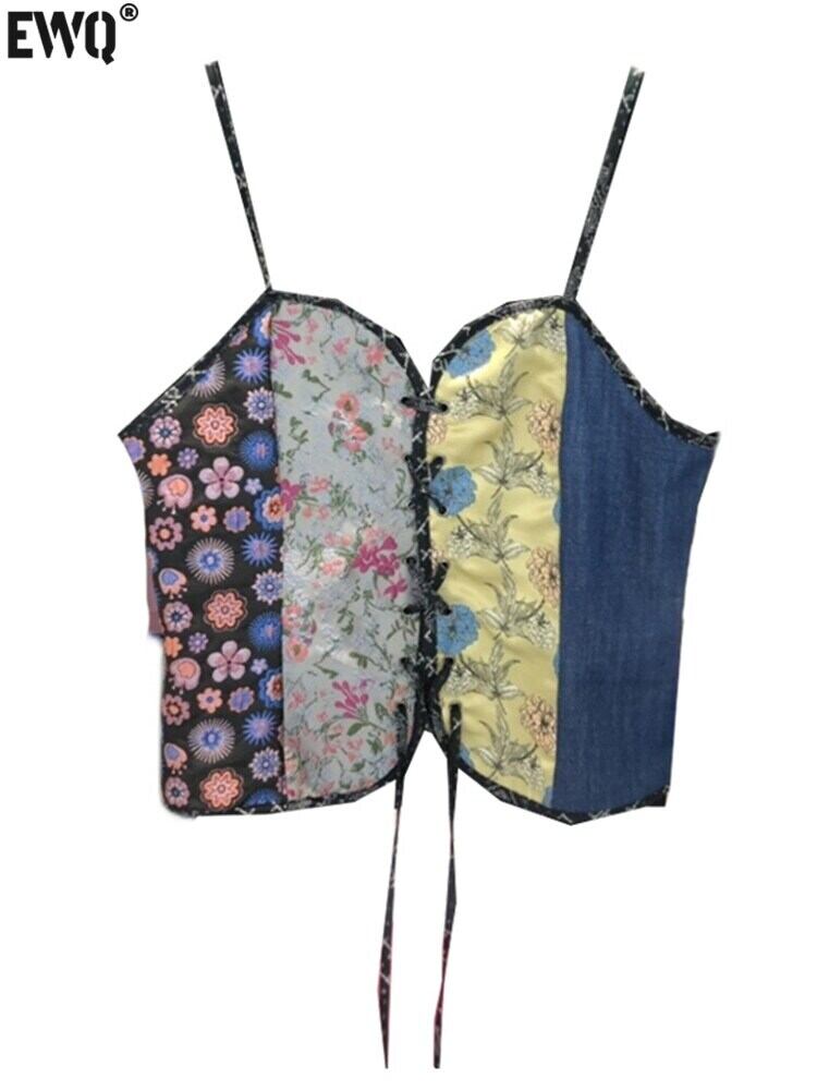 [EWQ] フラワー タンクトップ レディース シングル ブレスト プリント コントラスト キャミソール サマー タイド パッチワーク レトロ トップス 夏物 フラワーデザイン