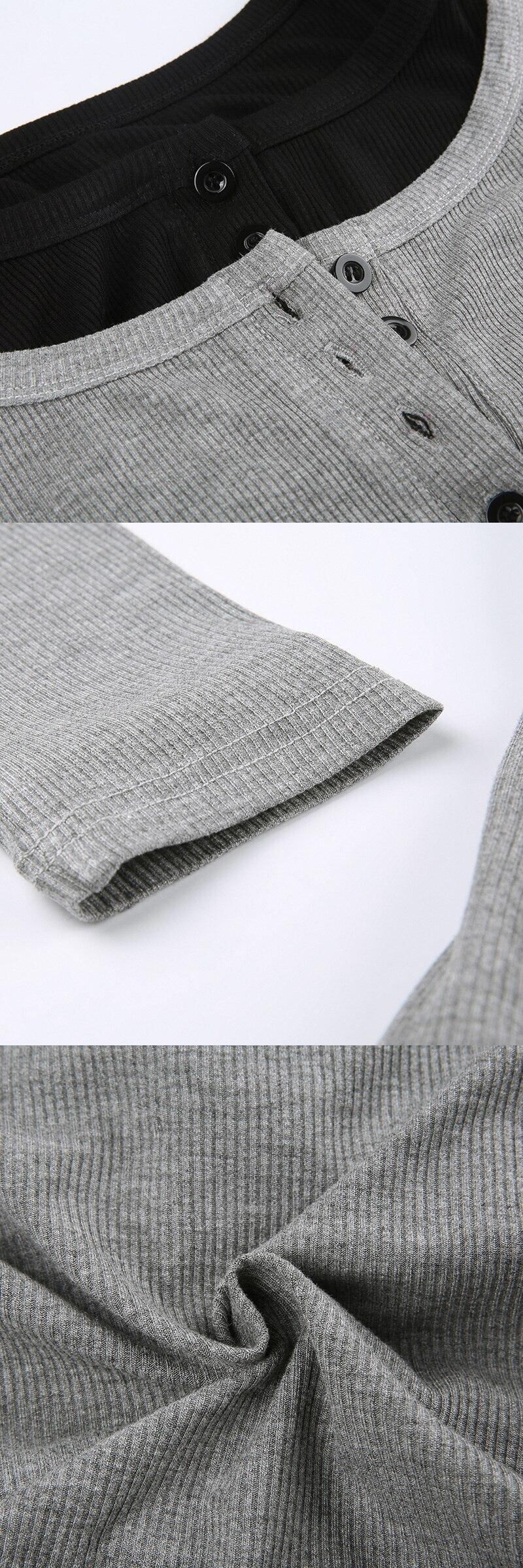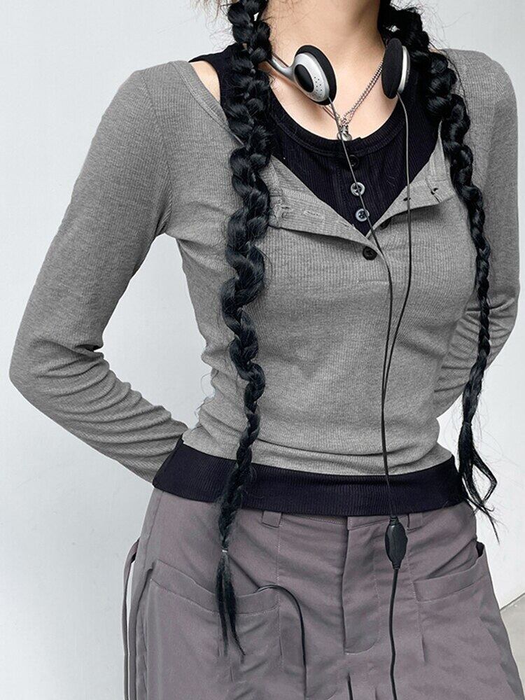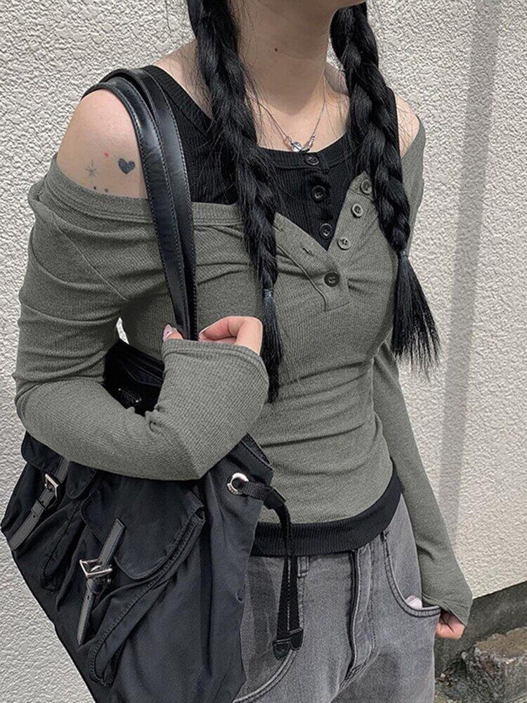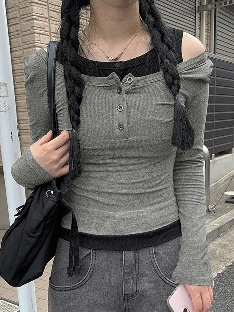 [EWQ] フェイクツーピースコントラストカラー Tシャツハーフオープンネックボタントップオフショルダースリムフィット Tシャツ春潮トップス スプリング 春物