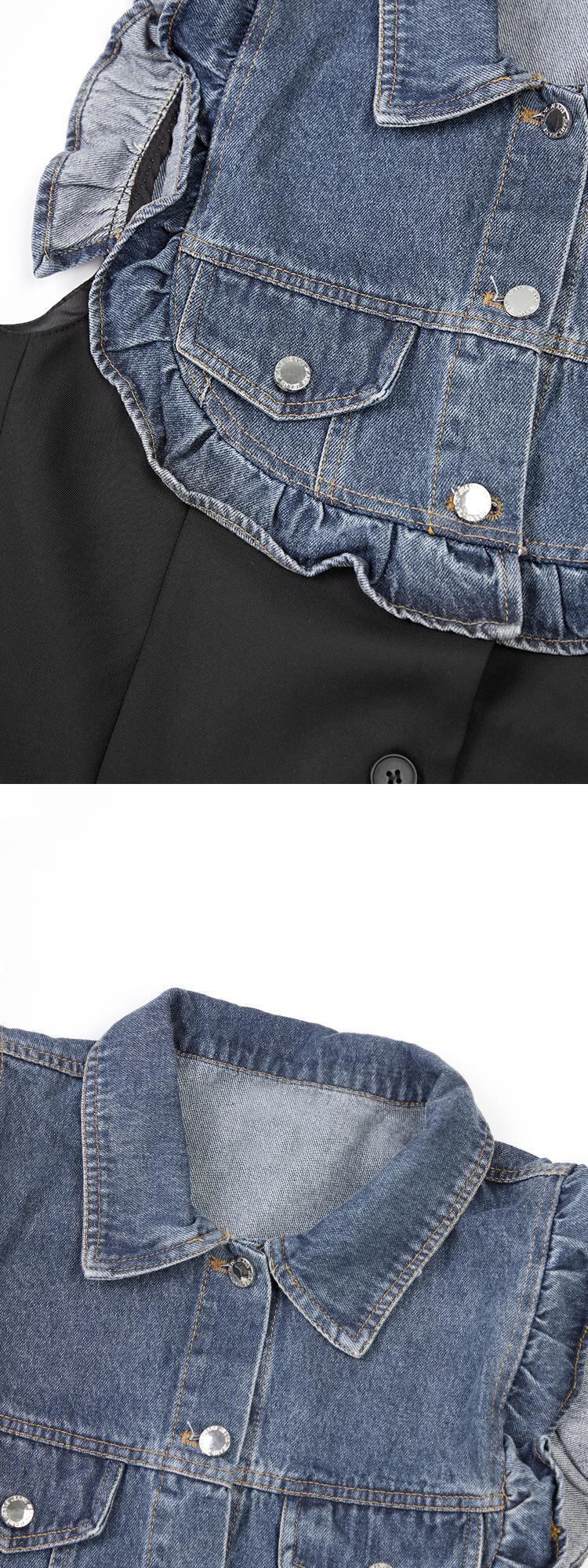 [EWQ] フェイクツーピーススプライスデニムジャケットフリルパッチワークシングルブレストノースリーブジャケットコート夏潮 サマー 夏物