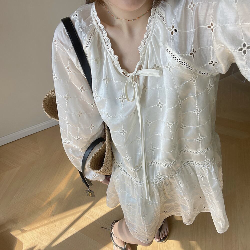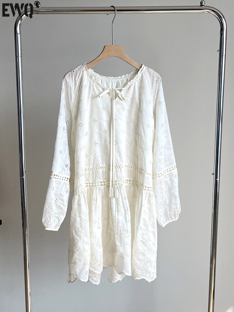 [EWQ] V ネック レース アップ ドレス フック花中空長袖ミニ ドレス夏潮優しい気質 Vestido ロング サマー 夏物 Vネック レースアップ フラワーデザイン