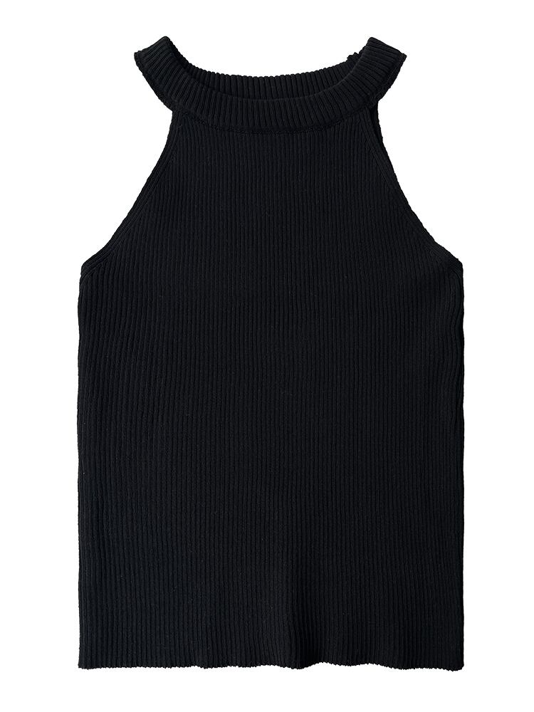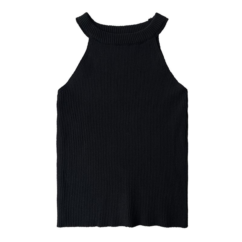 [EWQ] レディース スリム フィット ニット タンクトップ 伸縮性 O ネック オフショルダー ニット ベスト サマー タイド ブラック トップス エラスティック 夏物 Oネック