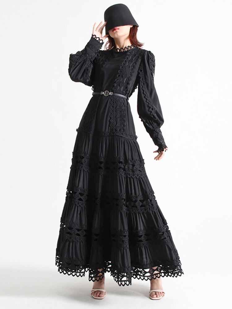 [EWQ] レース フック花中空ドレスできる長袖レースアップ高級イブニング パーティー ドレス春 ロング スプリング 春物 フラワーデザイン