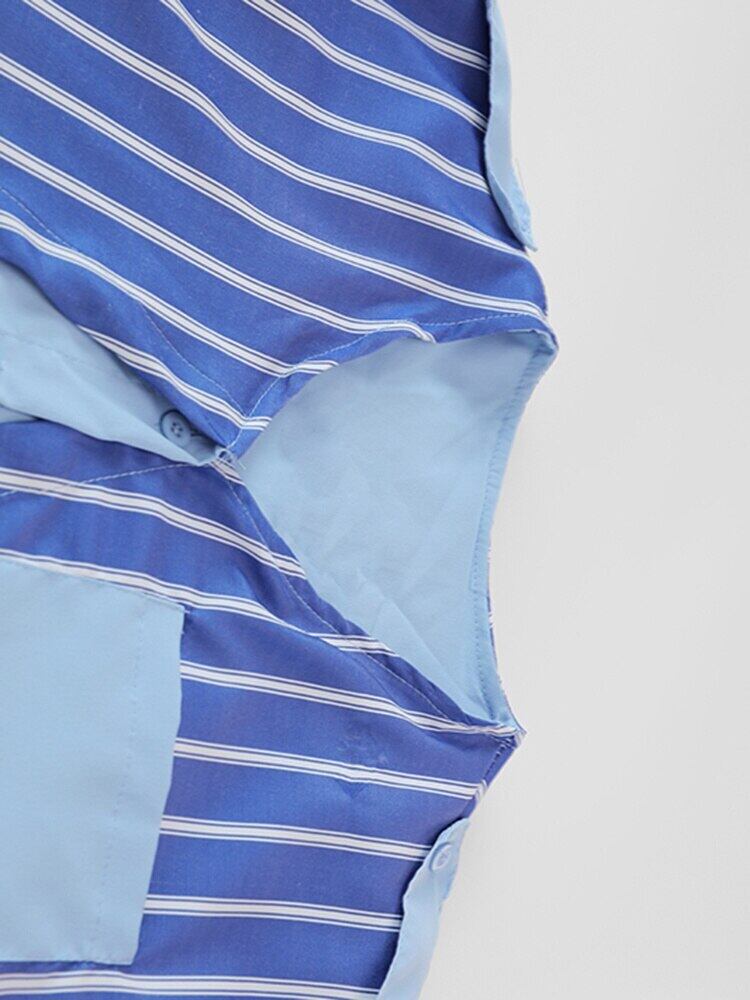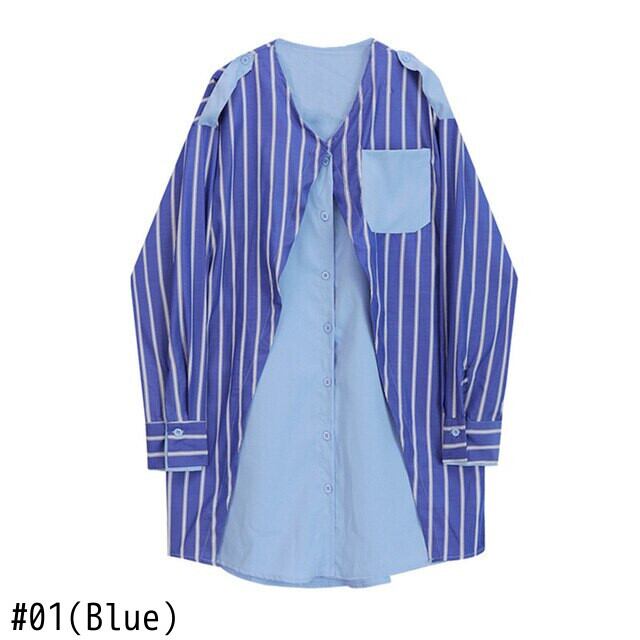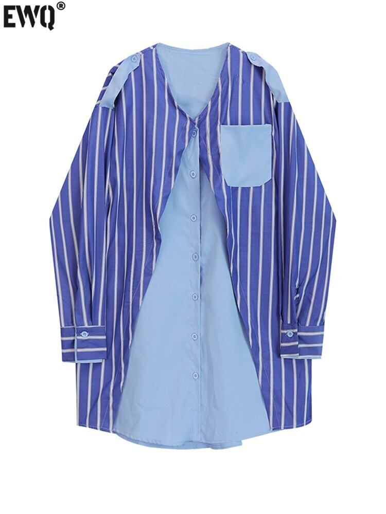 [EWQ] レディース ブルー ストライプ ビッグサイズ カラーブロック ワンピース Vネック 長袖 イレギュラー 潮 秋 春 Vestidos ロング スプリング 春物 オータム 秋物