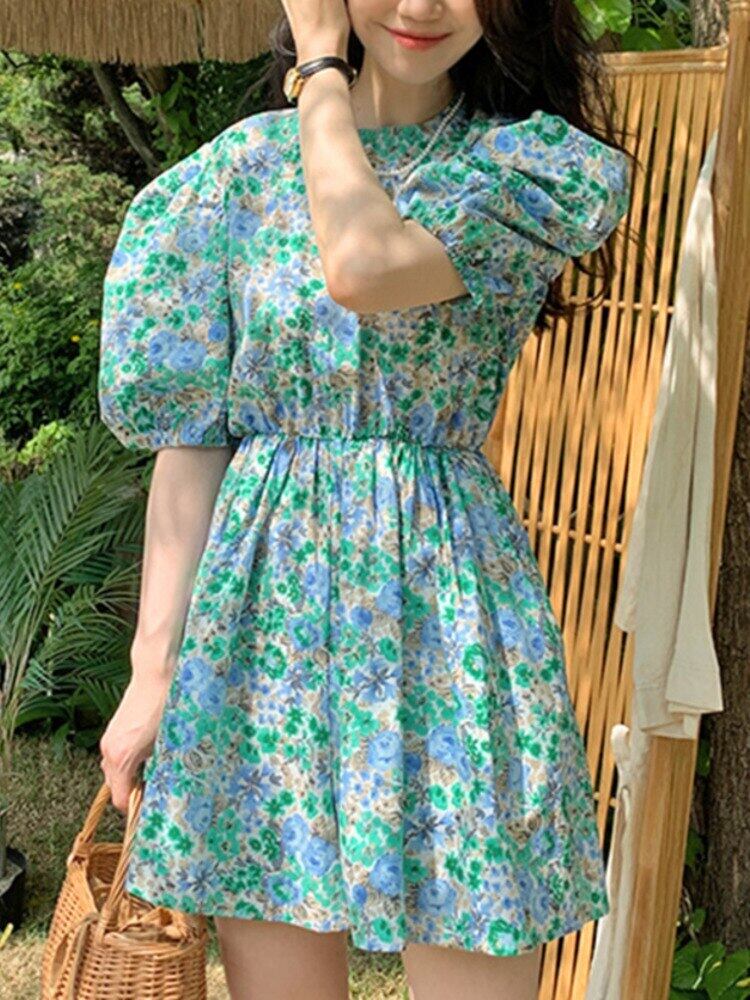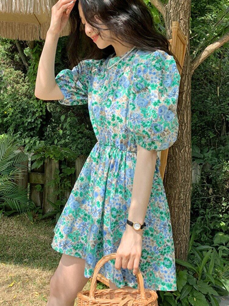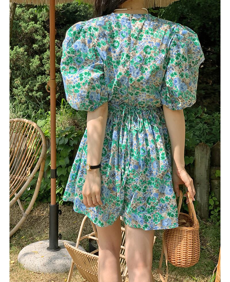 [EWQ] シック花ワイドレッグショートボディスーツパフスリーブコントラストカラー因果ロンパース夏潮 438 サマー 夏物 ワイドパンツ フラワーデザイン