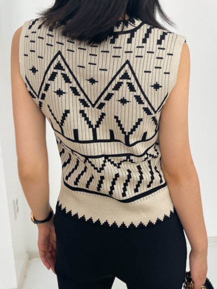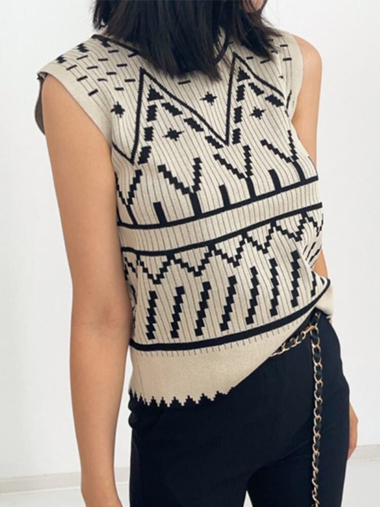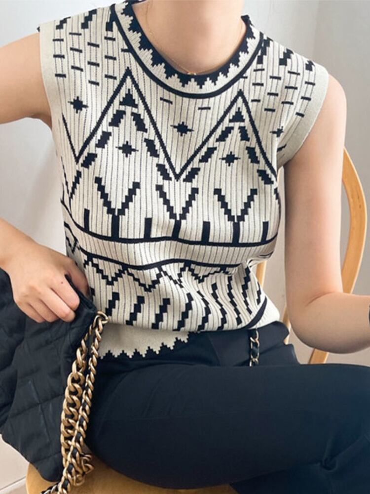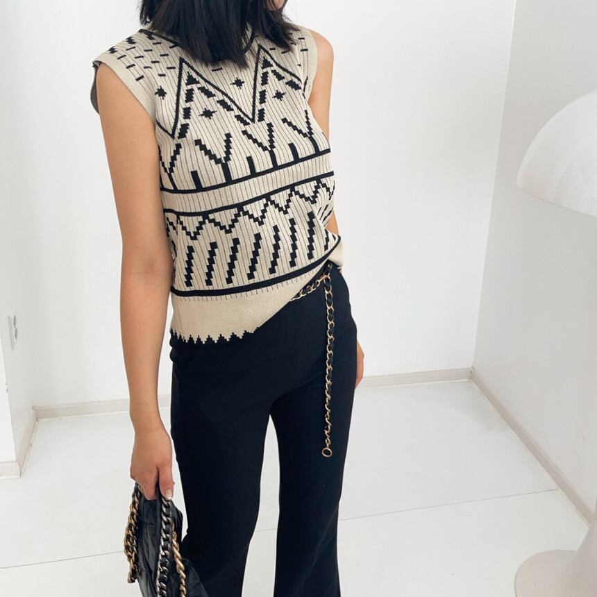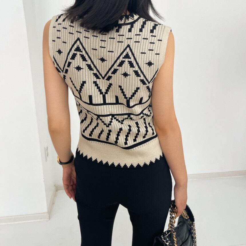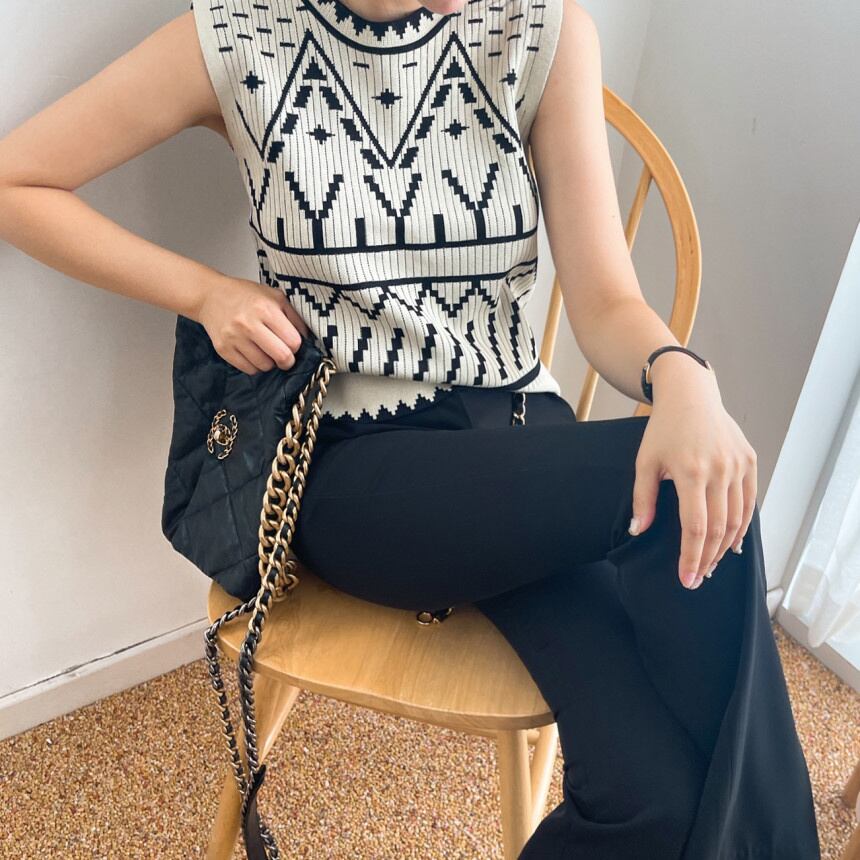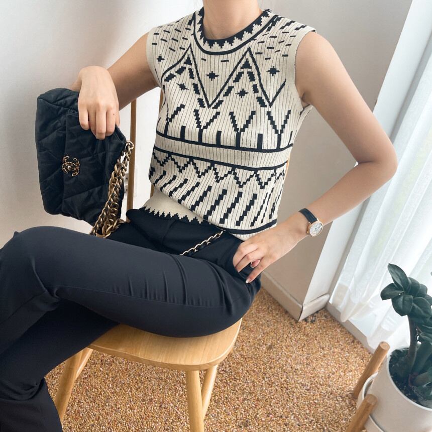 [EWQ] レディース イレギュラー プリント ジャカード ニット タンクトップ 夏潮 コントラストカラー ノースリーブ トップ ベスト 8391 サマー 夏物