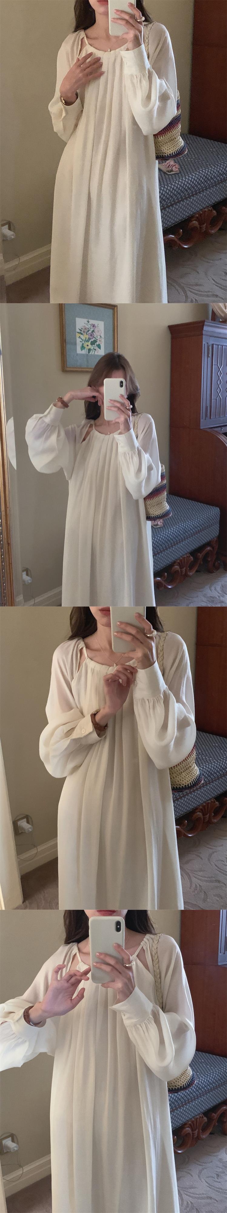 [EWQ] O ネック中空ルーズ ドレス長袖プリーツ無地マキシ ドレス春 Vestido 16Y7962 ロング スプリング 春物 Oネック ソリッドカラー