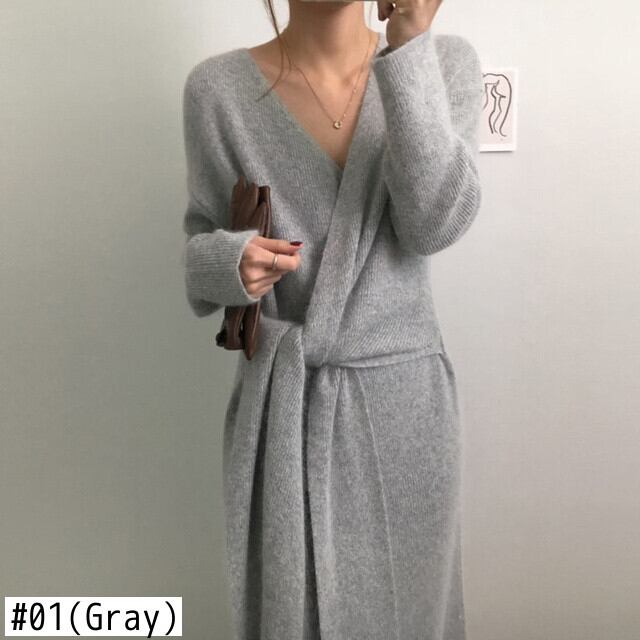 [EWQ] シック秋冬ゆったりアプリコット V ネック クロス サイド ストラップ ウエスト ニット セーター ドレス 16E2958 オータム 秋物 ウィンター 冬物 Vネック