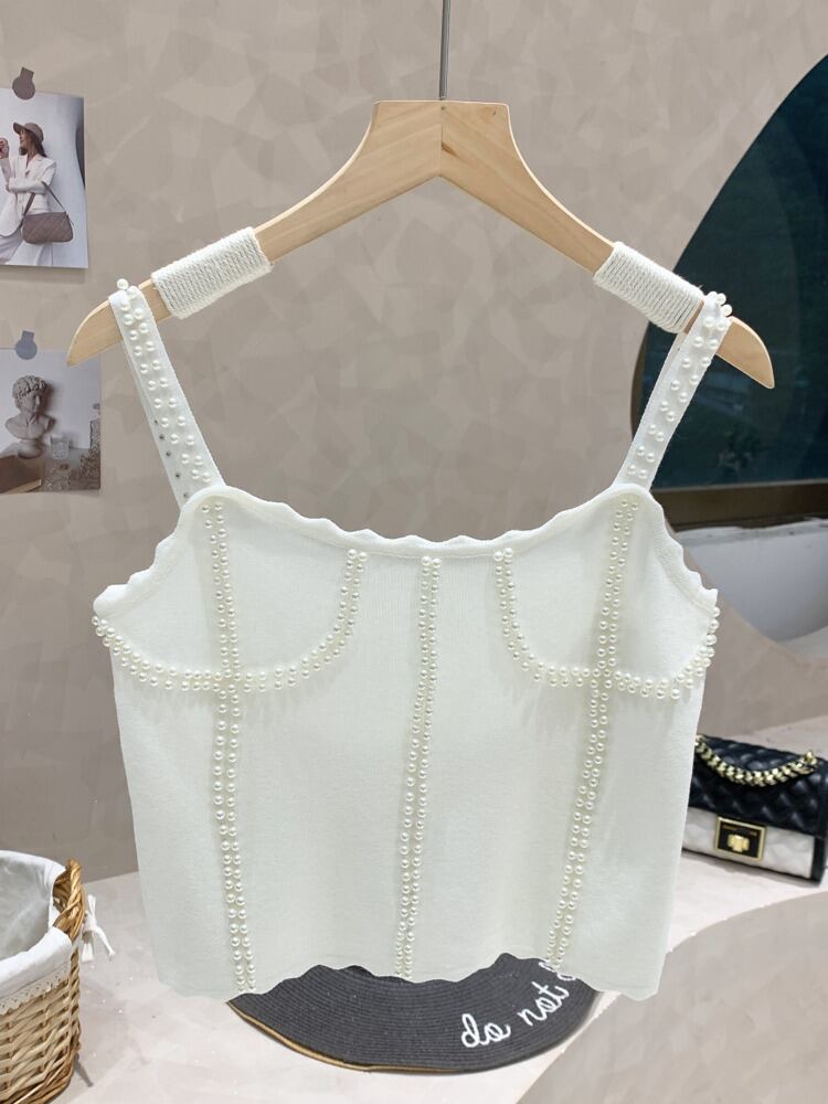 [EWQ] ホワイトスパイシーガールパール接合タンクトップ夏セクシーブラトップニットオフショルダーキャミソール 16Y9039 サマー 夏物 真珠